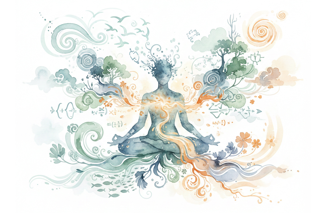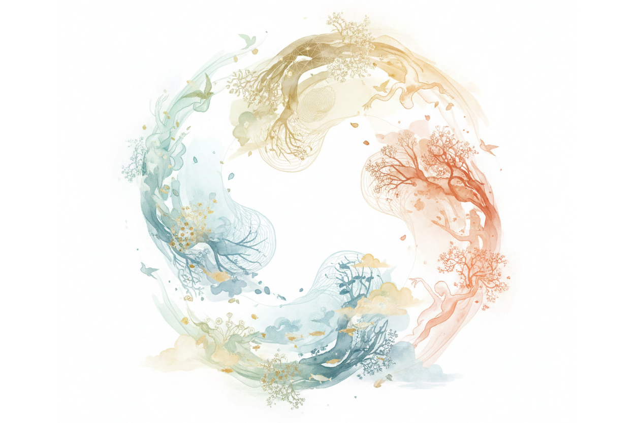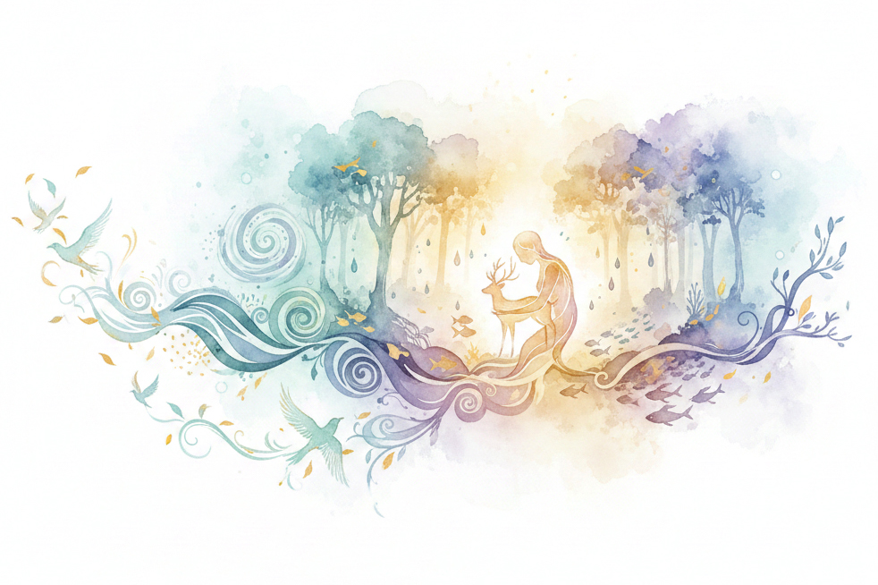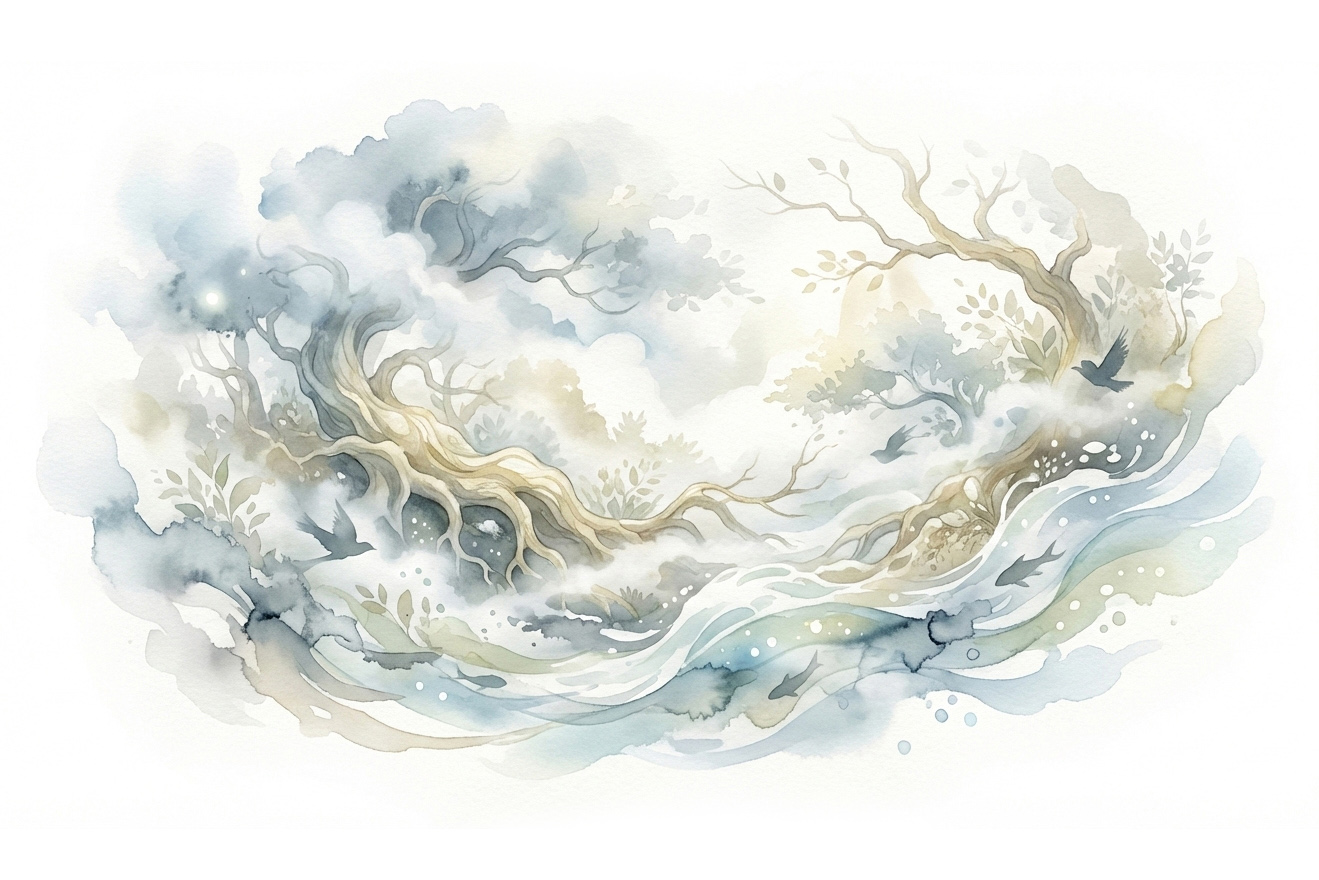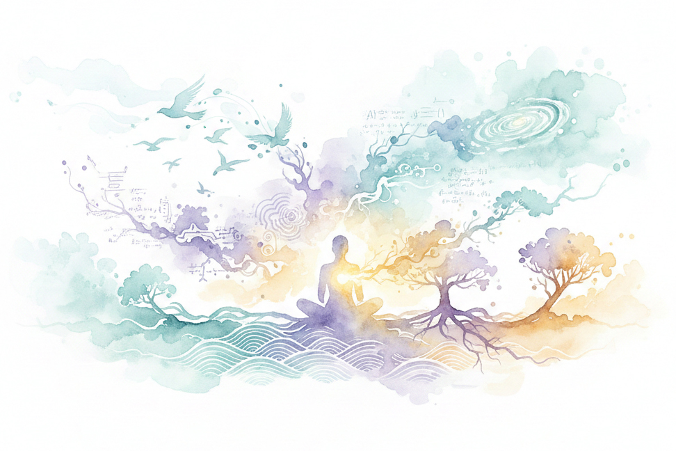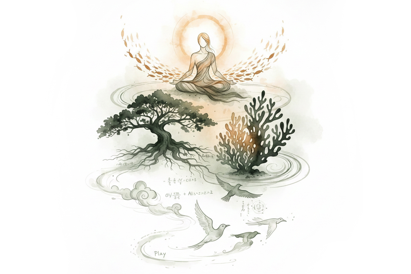 Abstract Zen meditation illustration, no text, no symbols. Gallery-scale composition for large-format print and editorial hero image — contemplative, human-centered, visually commanding without spectacle. Four subtle energies flow in a continuous living rhythm like breath: Play: light, airy motion, spontaneous ink-like brush strokes Learn: layered repetition, gentle refinement, subtle echoes of mathematics, physics, geometry, and AI technology — abstract patterns, iterative structures, evolving forms (no machines or UI) See: soft illumination revealing hidden depth and quiet dimensionality Empathize: warm connective radiance, spirituality, human kindness, compassion Color palette (choose ONE only, exactly four dominant colors: two cool + two warm): A) Dawn — misty blue, pale teal, soft violet, sunrise gold B) Tide — ocean blue, seafoam green, twilight indigo, warm sand C) Ember — blue hour blue, graphite blue, shadowed green, ember orange D) Forest — deep moss green, muted pine, soft charcoal, warm amber Randomly select one palette. Background: pure white, soft edges dissolve into white. Forms: organic only — mist, rivers, mountains, waves, clouds, galaxies, trees, roots, branches, leaves, butterfly, horse, deer, rabbits, doves, birds, fish, coral, seaweed, droplets of light, one human figure, animals — abstracted, gestural, non-photorealistic. No geometry, no symmetry, no mechanical forms, no UI. Composition: layered foreground, midground, background with cinematic depth and micro-details. Mood: mystical, serene, intelligent, deeply human. Texture: watercolor wash and sumi-e ink influence. No text, symbols, logos, icons, watermarks, diagrams, charts. --ar 16:9 --v 6 --q 2 --style raw