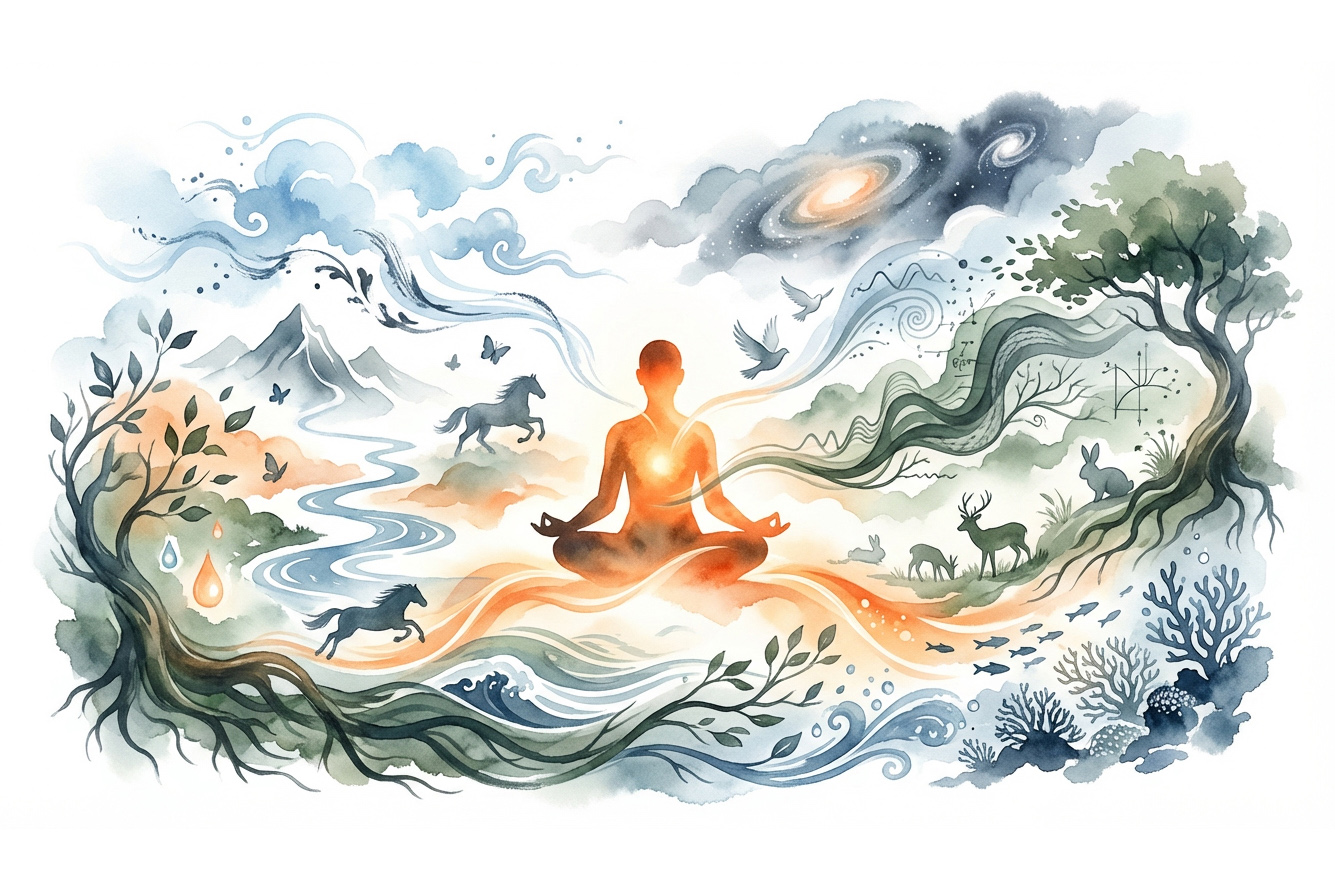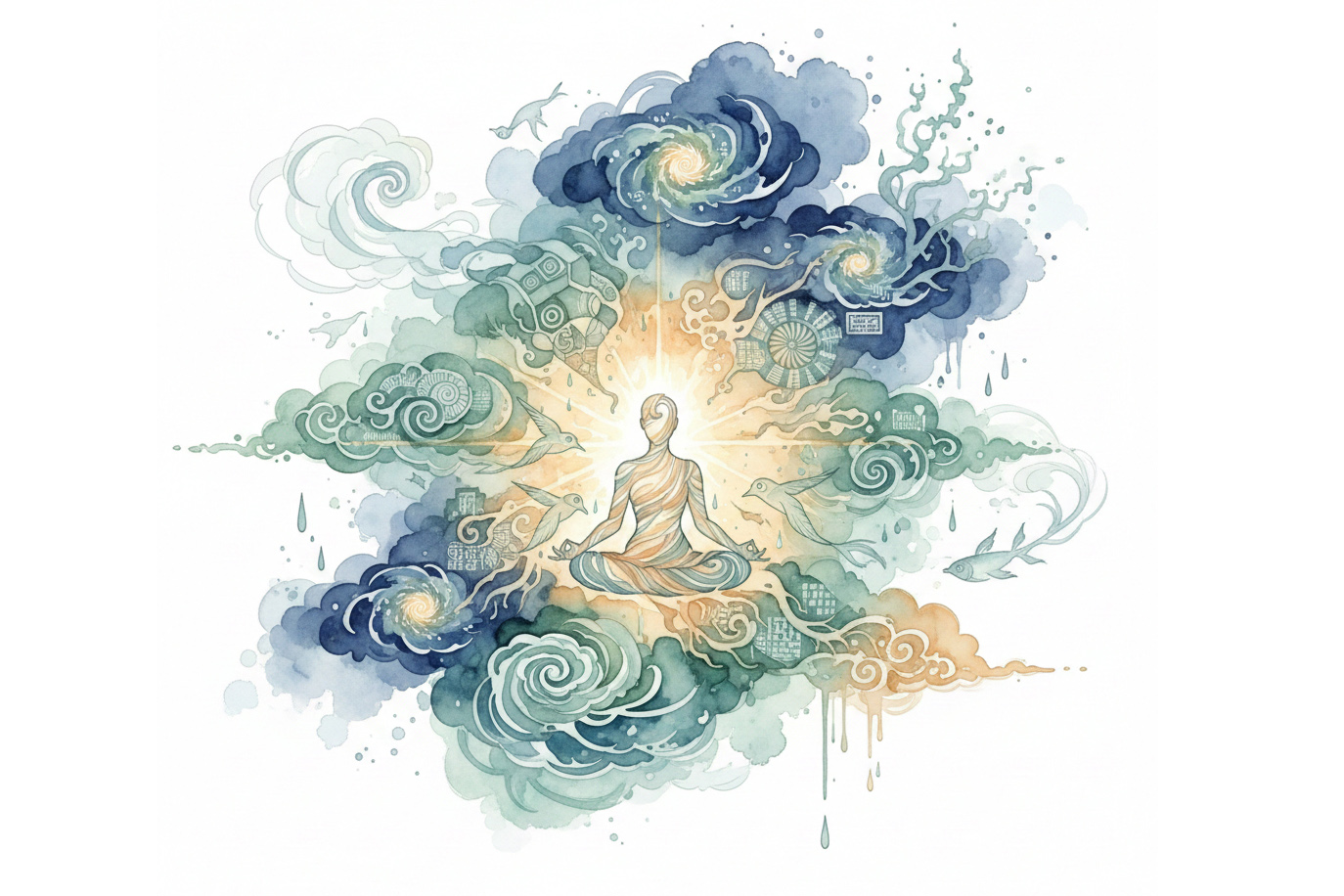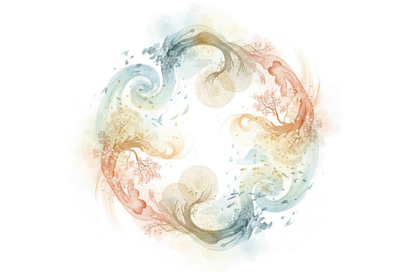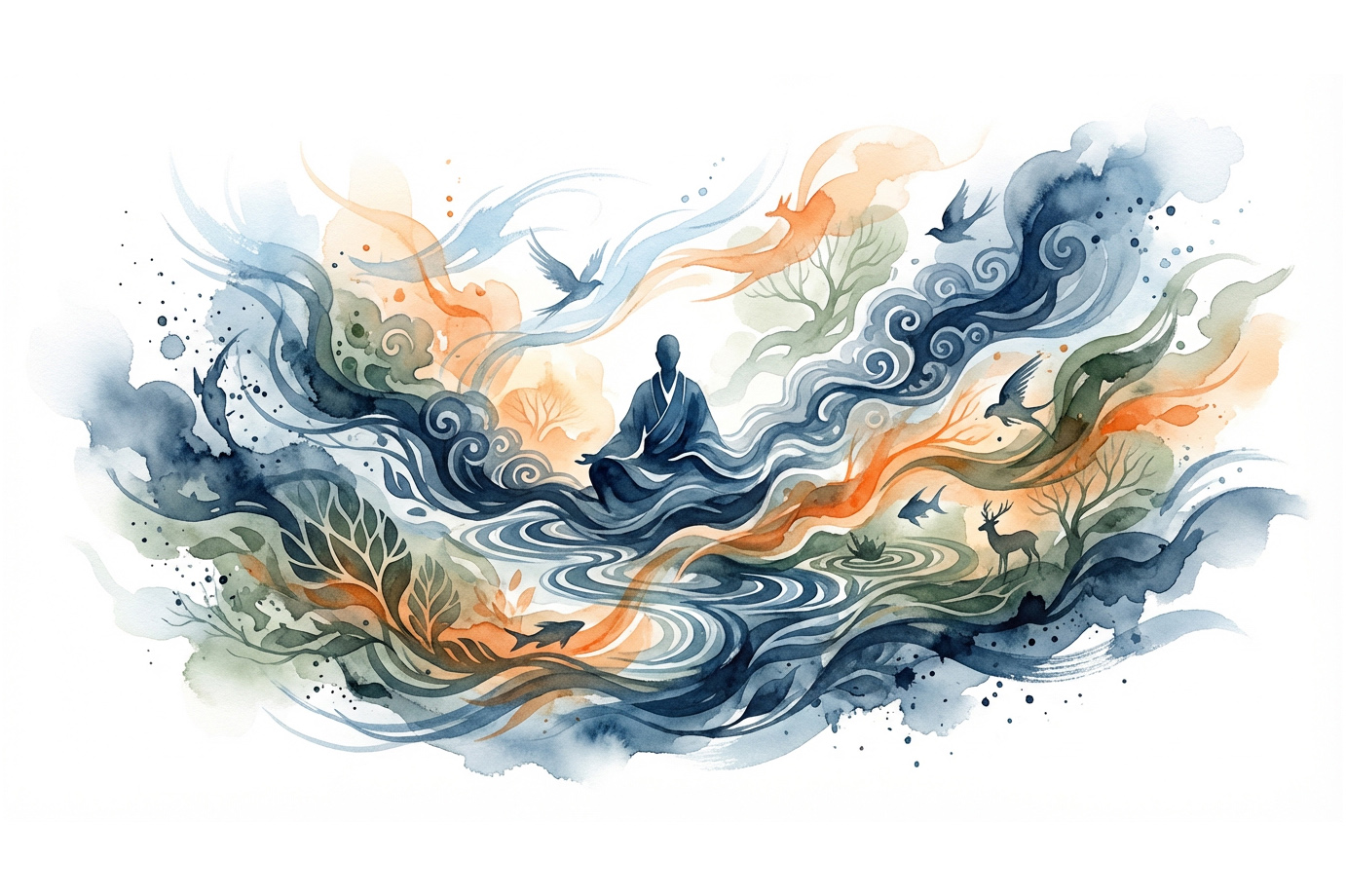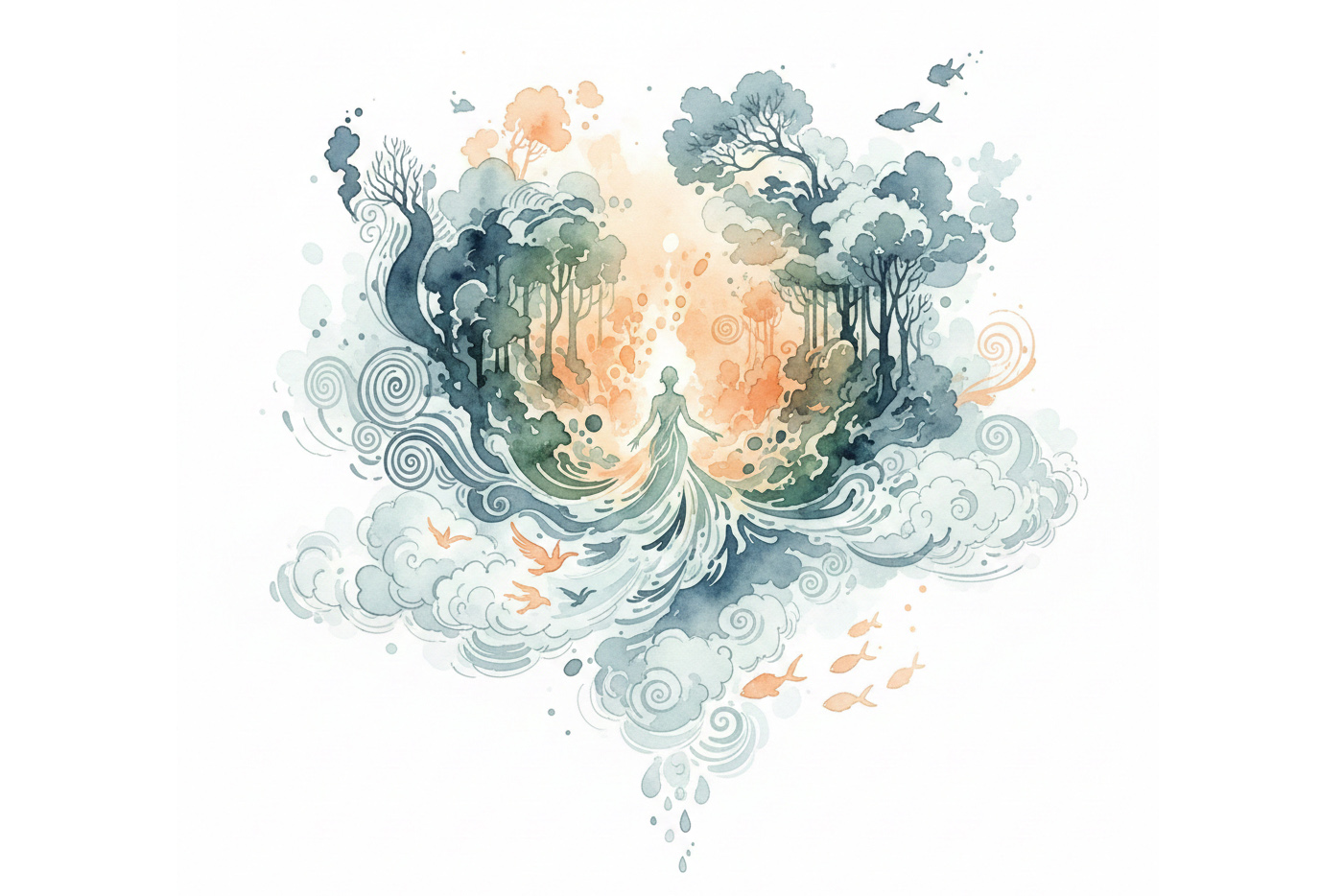 Abstract Zen meditation illustration, no text, no symbols. Gallery-scale composition for large-format print and editorial hero image — contemplative, human-centered, visually commanding without spectacle. Four subtle energies flow in a continuous living rhythm like breath: Play: light, airy motion, spontaneous ink-like brush strokes Learn: layered repetition, gentle refinement, subtle echoes of mathematics, physics, geometry, and AI technology — abstract patterns, iterative structures, evolving forms (no machines or UI) See: soft illumination revealing hidden depth and quiet dimensionality Empathize: warm connective radiance, spirituality, human kindness, compassion Color palette (choose ONE only, exactly four dominant colors: two cool + two warm): A) Dawn — misty blue, pale teal, soft violet, sunrise gold B) Tide — ocean blue, seafoam green, twilight indigo, warm sand C) Ember — blue hour blue, graphite blue, shadowed green, ember orange D) Forest — deep moss green, muted pine, soft charcoal, warm amber Randomly select one palette. Background: pure white, soft edges dissolve into white. Forms: organic only — mist, rivers, mountains, waves, clouds, galaxies, trees, roots, branches, leaves, butterfly, horse, deer, rabbits, doves, birds, fish, coral, seaweed, droplets of light, one human figure, animals — abstracted, gestural, non-photorealistic. No geometry, no symmetry, no mechanical forms, no UI. Composition: layered foreground, midground, background with cinematic depth and micro-details. Mood: mystical, serene, intelligent, deeply human. Texture: watercolor wash and sumi-e ink influence. No text, symbols, logos, icons, watermarks, diagrams, charts. --ar 16:9 --v 6 --q 2 --style raw