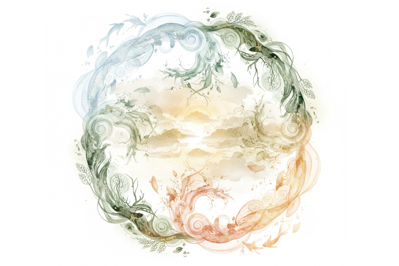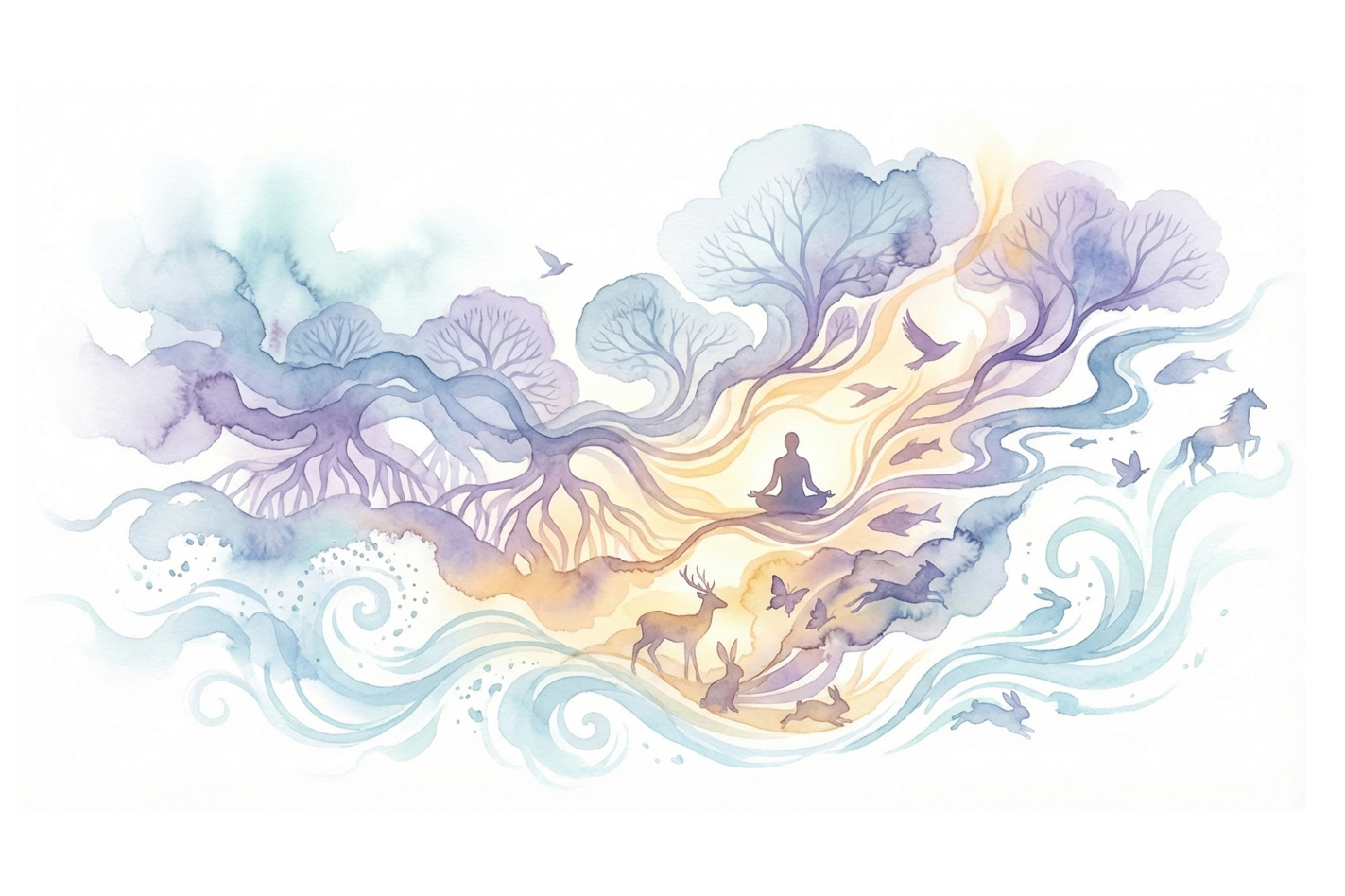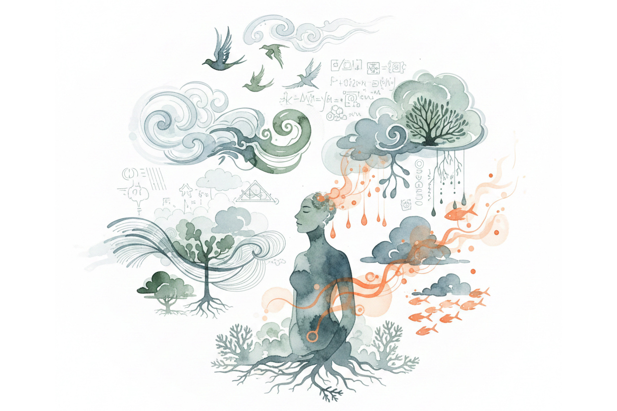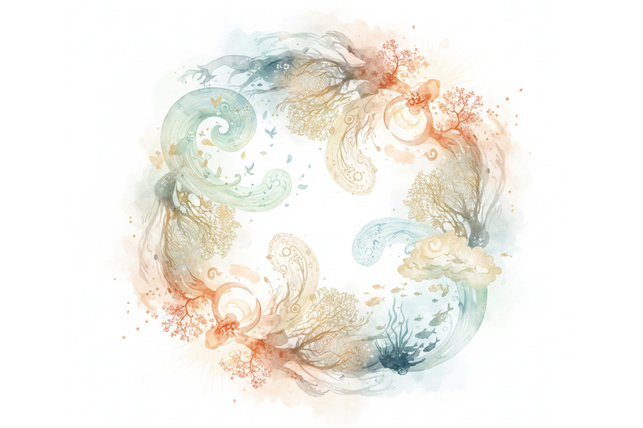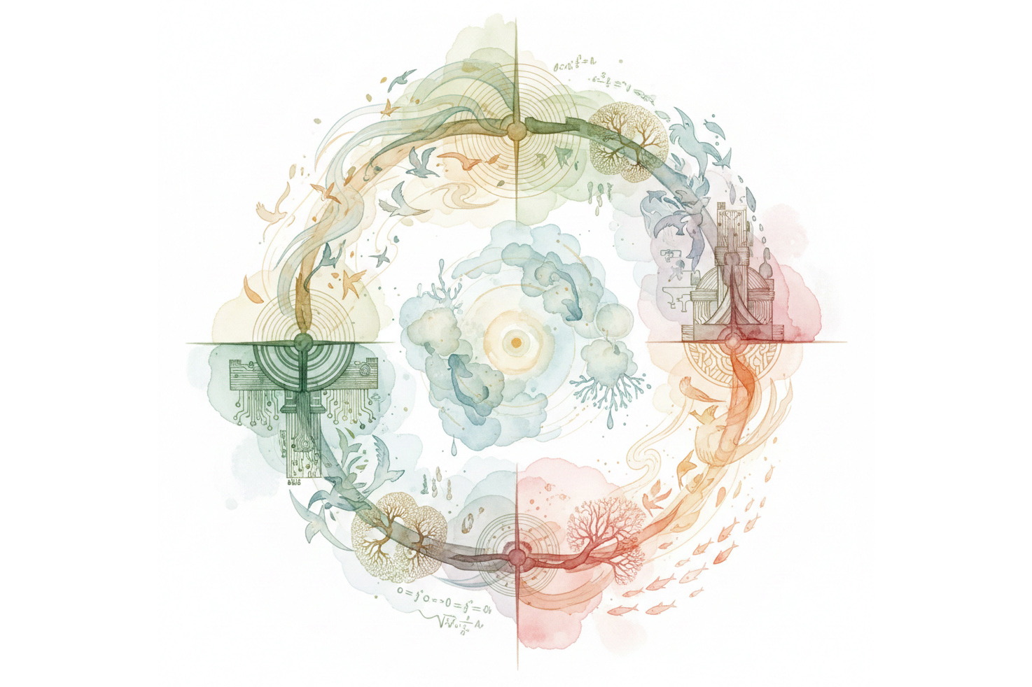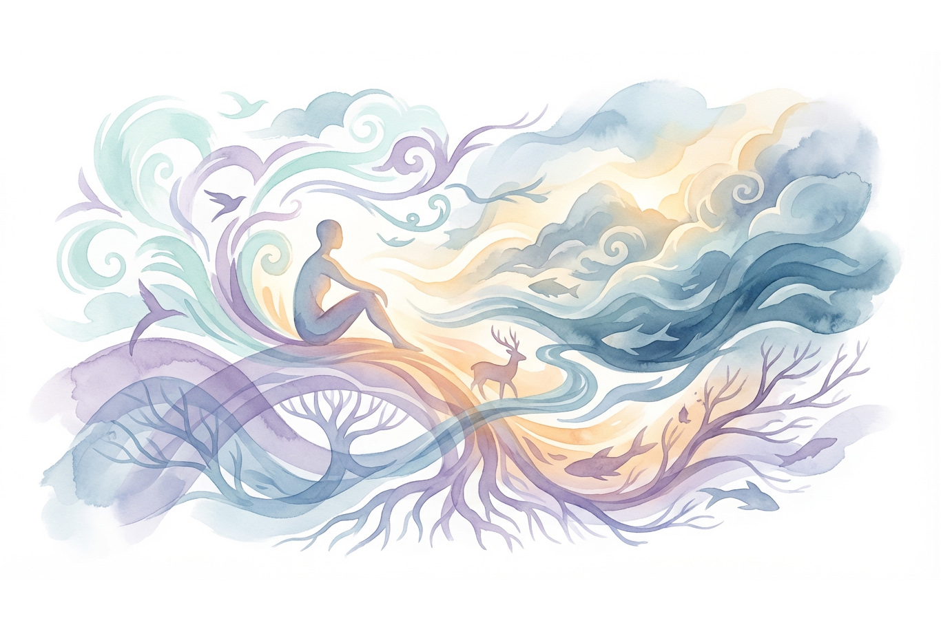 Abstract Zen meditation illustration, no text, no symbols. Gallery-scale composition for large-format print and editorial hero image — contemplative, human-centered, visually commanding without spectacle. Four subtle energies flow in a continuous living rhythm like breath: Play: light, airy motion, spontaneous ink-like brush strokes Learn: layered repetition, gentle refinement, subtle echoes of mathematics, physics, geometry, and AI technology — abstract patterns, iterative structures, evolving forms (no machines or UI) See: soft illumination revealing hidden depth and quiet dimensionality Empathize: warm connective radiance, spirituality, human kindness, compassion Color palette (choose ONE only, exactly four dominant colors: two cool + two warm): A) Dawn — misty blue, pale teal, soft violet, sunrise gold B) Tide — ocean blue, seafoam green, twilight indigo, warm sand C) Ember — blue hour blue, graphite blue, shadowed green, ember orange D) Forest — deep moss green, muted pine, soft charcoal, warm amber Randomly select one palette. Background: pure white, soft edges dissolve into white. Forms: organic only — mist, rivers, mountains, waves, clouds, galaxies, trees, roots, branches, leaves, butterfly, horse, deer, rabbits, doves, birds, fish, coral, seaweed, droplets of light, one human figure, animals — abstracted, gestural, non-photorealistic. No geometry, no symmetry, no mechanical forms, no UI. Composition: layered foreground, midground, background with cinematic depth and micro-details. Mood: mystical, serene, intelligent, deeply human. Texture: watercolor wash and sumi-e ink influence. No text, symbols, logos, icons, watermarks, diagrams, charts. --ar 16:9 --v 6 --q 2 --style raw