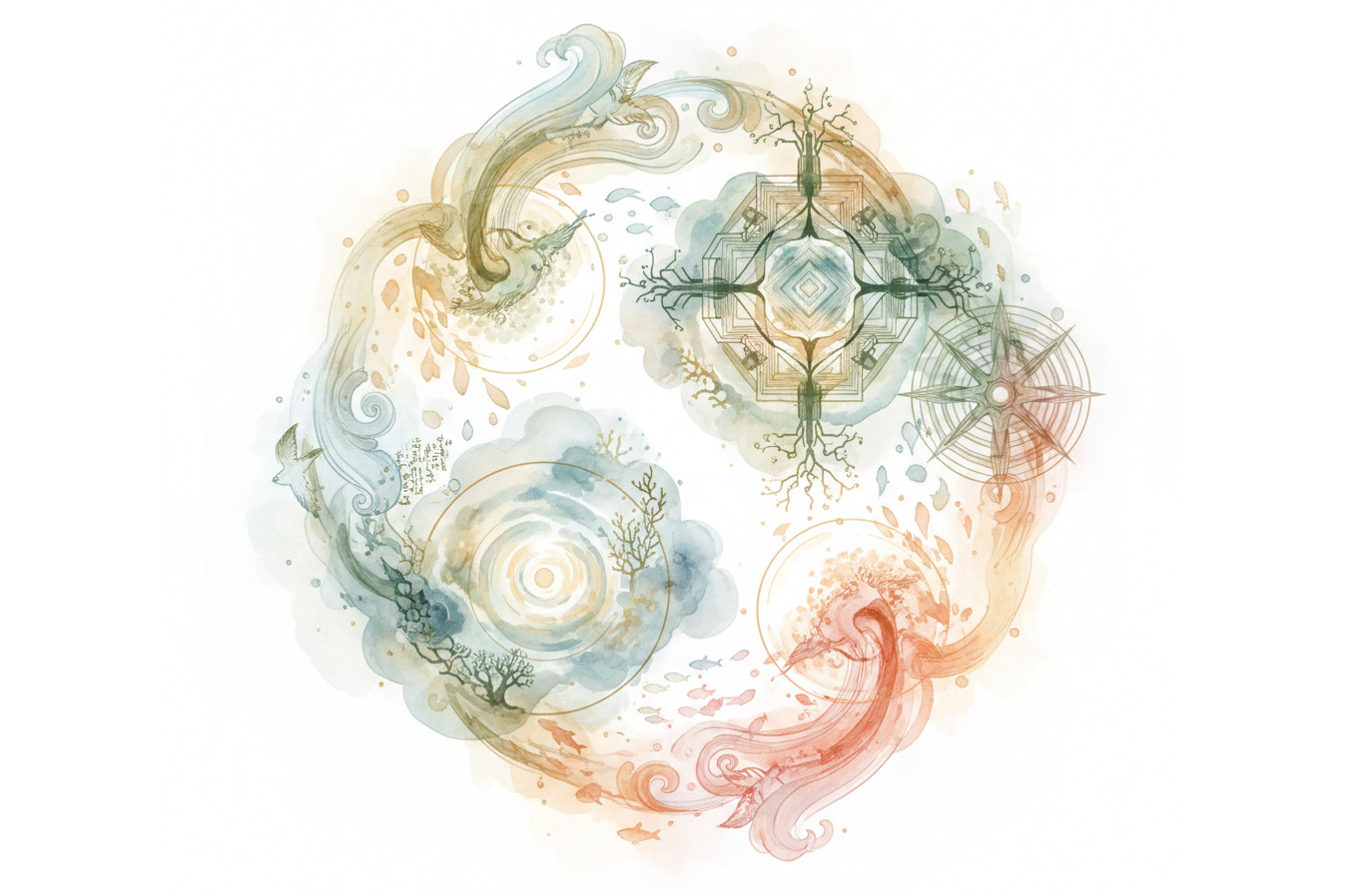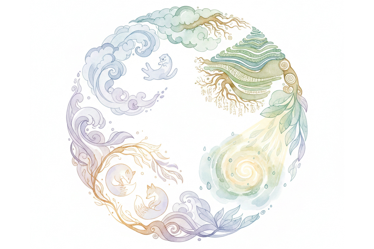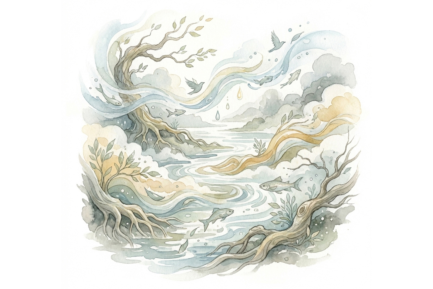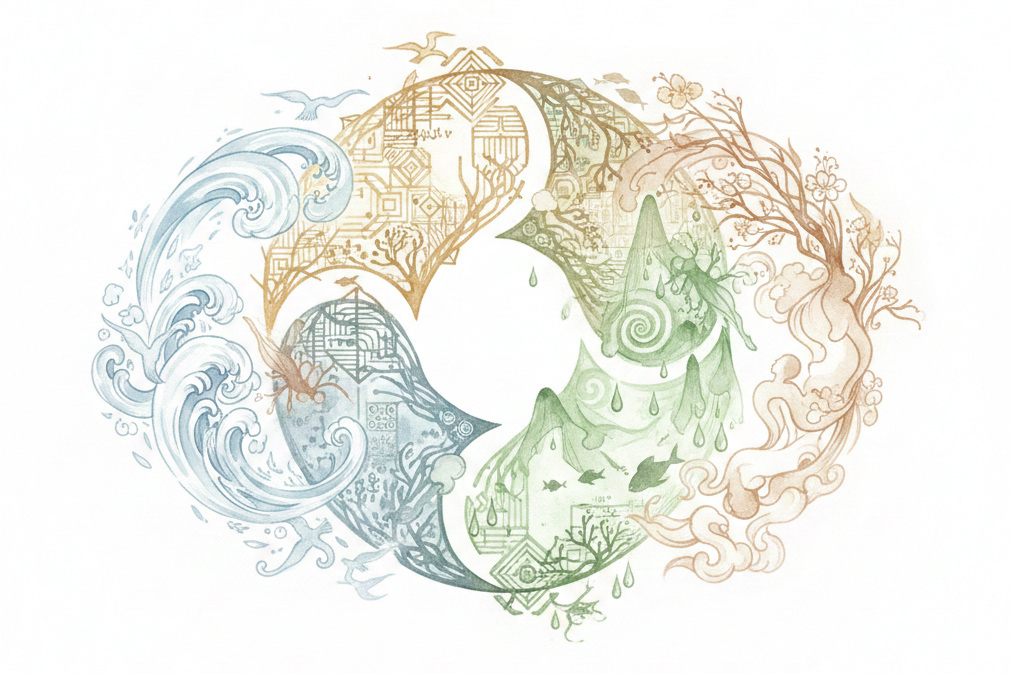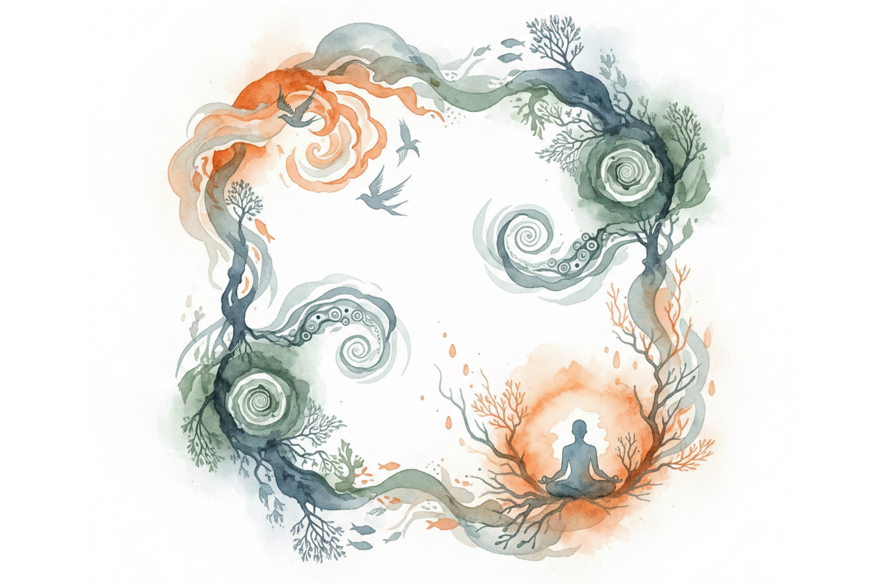 Abstract Zen meditation illustration, no text, no symbols. Gallery-scale composition for large-format print and editorial hero image — contemplative, human-centered, visually commanding without spectacle. Four subtle energies flow in a continuous living rhythm like breath: Play: light, airy motion, spontaneous ink-like brush strokes Learn: layered repetition, gentle refinement, subtle echoes of mathematics, physics, geometry, and AI technology — abstract patterns, iterative structures, evolving forms (no machines or UI) See: soft illumination revealing hidden depth and quiet dimensionality Empathize: warm connective radiance, spirituality, human kindness, compassion Color palette (choose ONE only, exactly four dominant colors: two cool + two warm): A) Dawn — misty blue, pale teal, soft violet, sunrise gold B) Tide — ocean blue, seafoam green, twilight indigo, warm sand C) Ember — blue hour blue, graphite blue, shadowed green, ember orange D) Forest — deep moss green, muted pine, soft charcoal, warm amber Randomly select one palette. Background: pure white, soft edges dissolve into white. Forms: organic only — mist, rivers, mountains, waves, clouds, galaxies, trees, roots, branches, leaves, butterfly, horse, deer, rabbits, doves, birds, fish, coral, seaweed, droplets of light, one human figure, animals — abstracted, gestural, non-photorealistic. No geometry, no symmetry, no mechanical forms, no UI. Composition: layered foreground, midground, background with cinematic depth and micro-details. Mood: mystical, serene, intelligent, deeply human. Texture: watercolor wash and sumi-e ink influence. No text, symbols, logos, icons, watermarks, diagrams, charts. --ar 16:9 --v 6 --q 2 --style raw