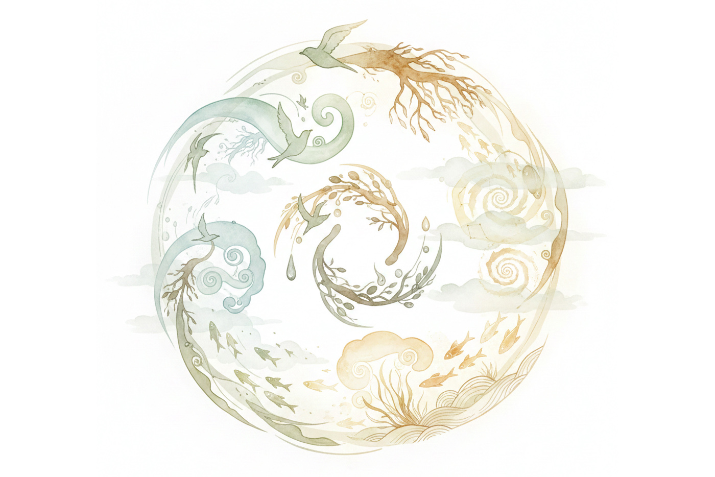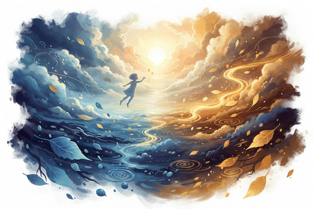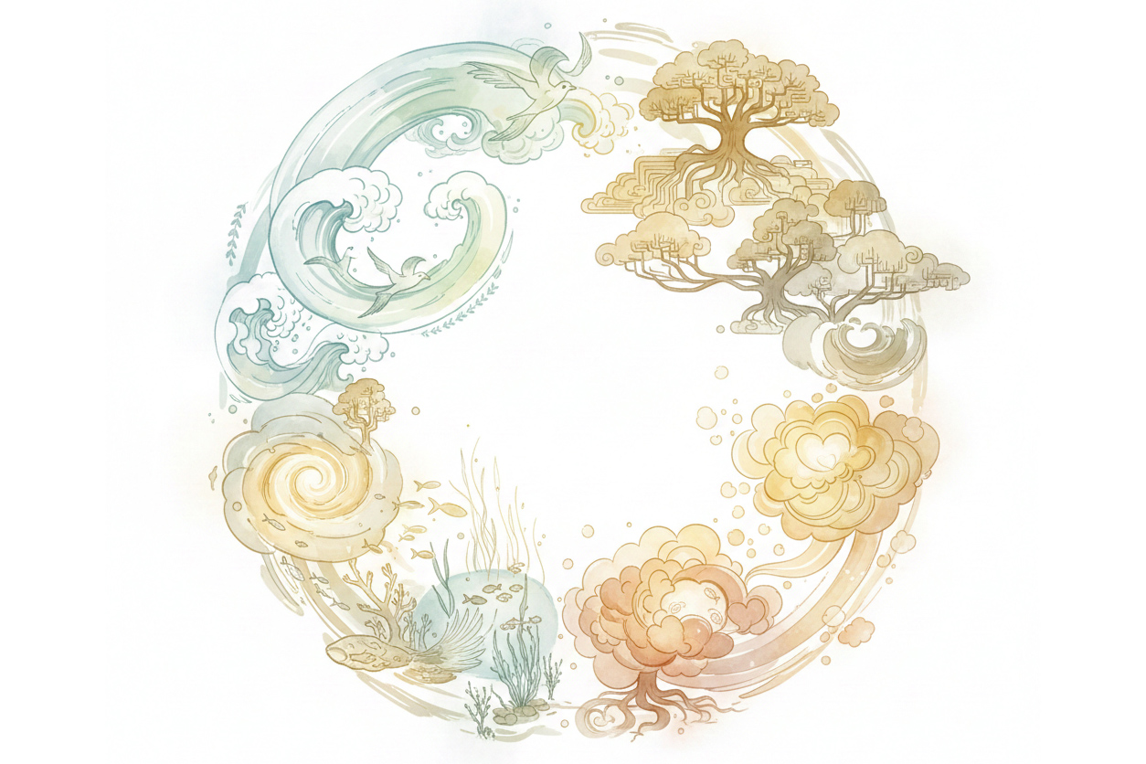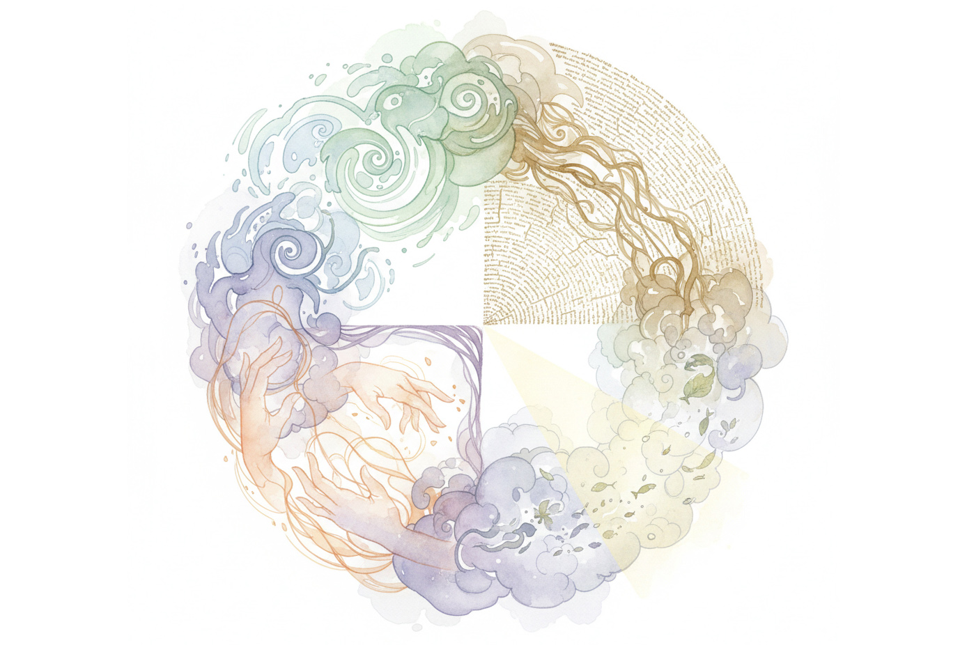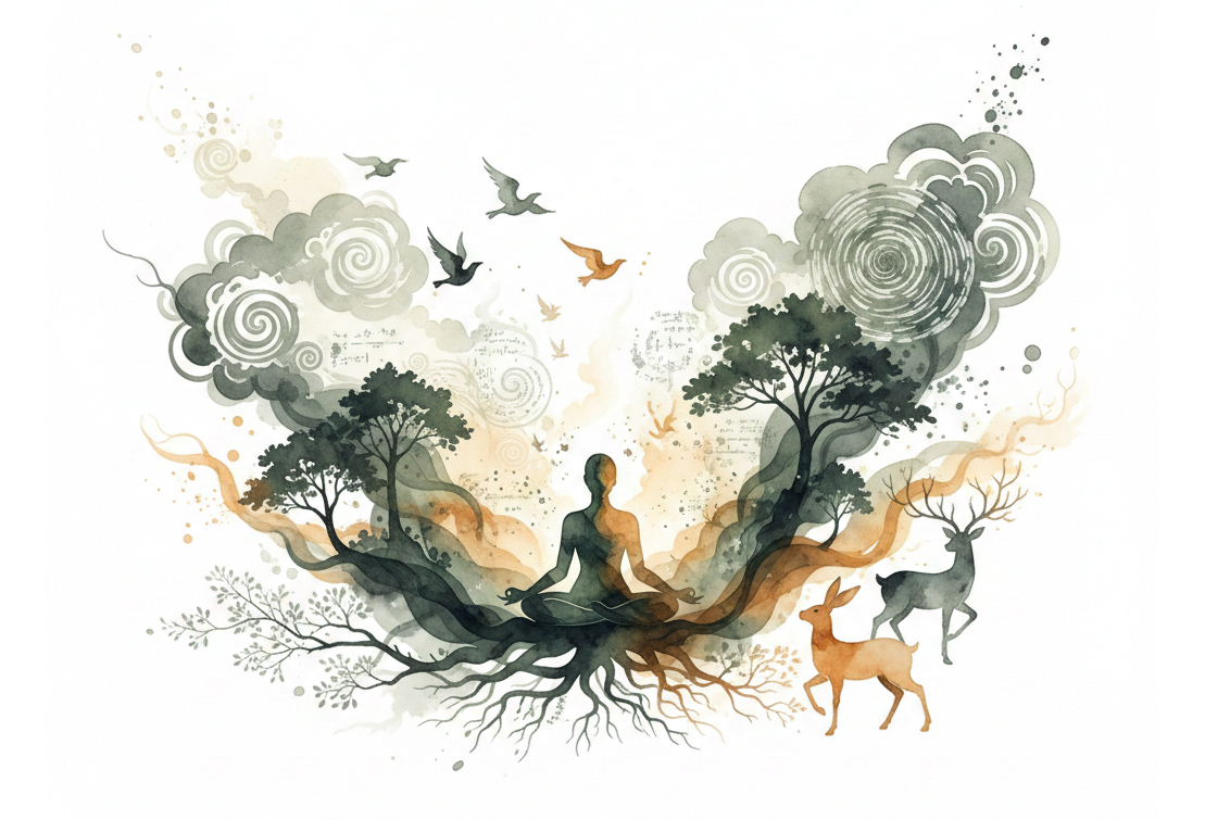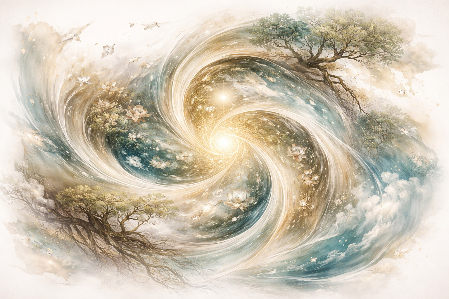 Abstract Zen meditation illustration, no text, no symbols. Gallery-scale composition for large-format print and editorial hero image — contemplative, human-centered, visually commanding without spectacle. Four subtle energies flow in a continuous living rhythm like breath: Play: light, airy motion, spontaneous ink-like brush strokes Learn: layered repetition, gentle refinement, subtle echoes of mathematics, physics, geometry, and AI technology — abstract patterns, iterative structures, evolving forms (no machines or UI) See: soft illumination revealing hidden depth and quiet dimensionality Empathize: warm connective radiance, spirituality, human kindness, compassion Color palette (choose ONE only, exactly four dominant colors: two cool + two warm): A) Dawn — misty blue, pale teal, soft violet, sunrise gold B) Tide — ocean blue, seafoam green, twilight indigo, warm sand C) Ember — blue hour blue, graphite blue, shadowed green, ember orange D) Forest — deep moss green, muted pine, soft charcoal, warm amber Randomly select one palette. Background: pure white, soft edges dissolve into white. Forms: organic only — mist, rivers, mountains, waves, clouds, galaxies, trees, roots, branches, leaves, butterfly, horse, deer, rabbits, doves, birds, fish, coral, seaweed, droplets of light, one human figure, animals — abstracted, gestural, non-photorealistic. No geometry, no symmetry, no mechanical forms, no UI. Composition: layered foreground, midground, background with cinematic depth and micro-details. Mood: mystical, serene, intelligent, deeply human. Texture: watercolor wash and sumi-e ink influence. No text, symbols, logos, icons, watermarks, diagrams, charts. --ar 16:9 --v 6 --q 2 --style raw