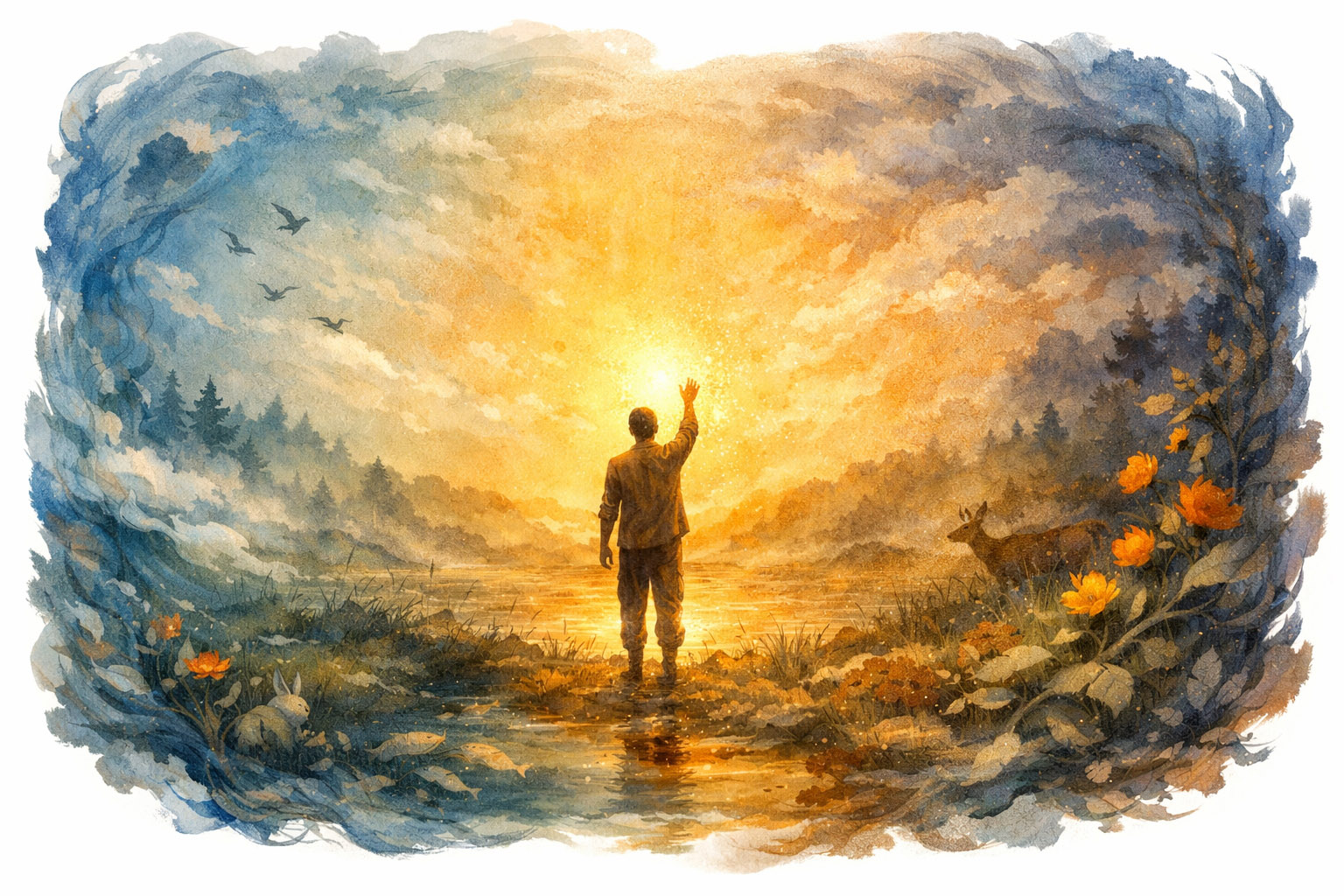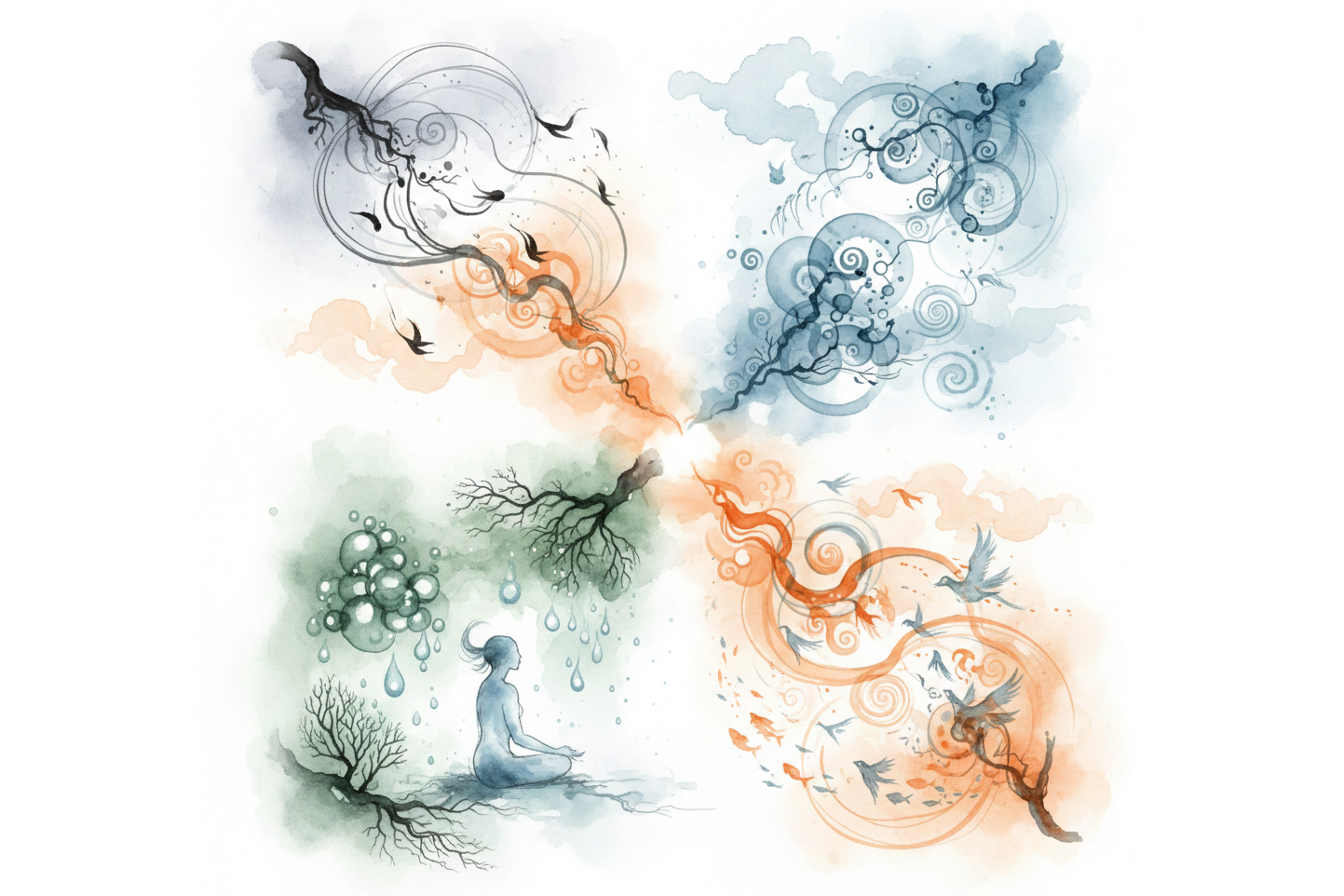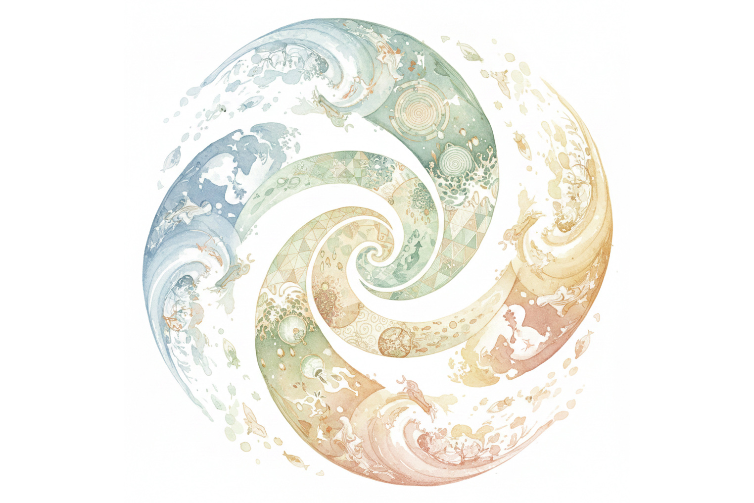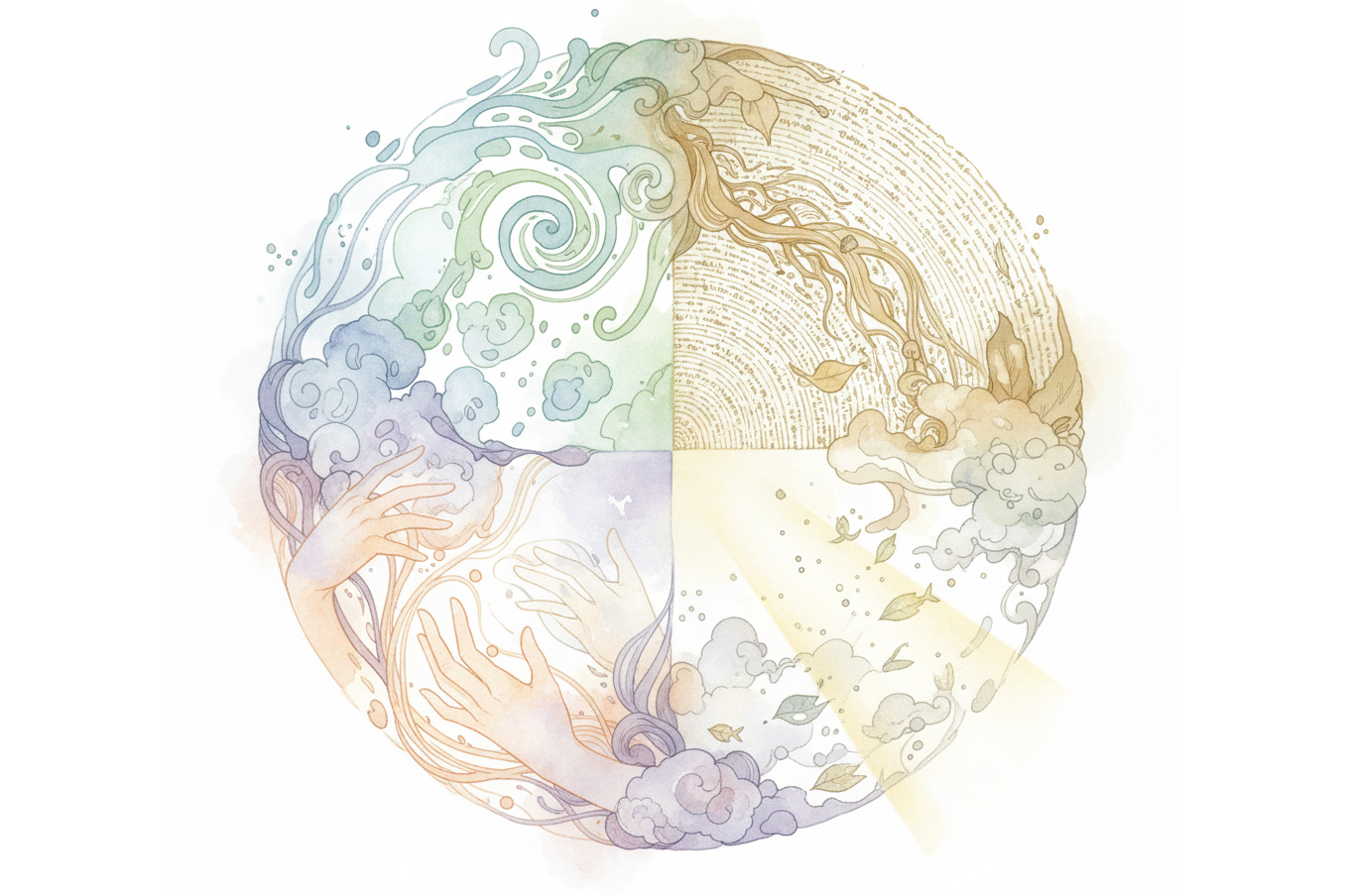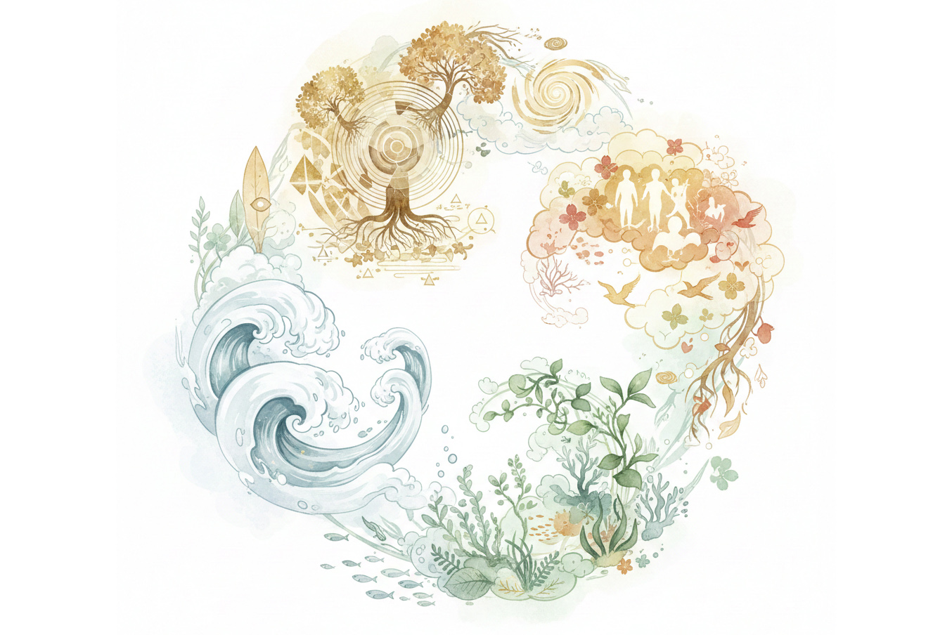Abstract Zen meditation illustration, no text, no symbols. Gallery-scale composition for large-format print and editorial hero image — contemplative, human-centered, visually commanding without spectacle. Four subtle energies flow in a continuous living rhythm like breath: Play: light, airy motion, spontaneous ink-like brush strokes Learn: layered repetition, gentle refinement, subtle echoes of mathematics, physics, geometry, and AI technology — abstract patterns, iterative structures, evolving forms (no machines or UI) See: soft illumination revealing hidden depth and quiet dimensionality Empathize: warm connective radiance, spirituality, human kindness, compassion Color palette (choose ONE only, exactly four dominant colors: two cool + two warm): A) Dawn — misty blue, pale teal, soft violet, sunrise gold B) Tide — ocean blue, seafoam green, twilight indigo, warm sand C) Ember — blue hour blue, graphite blue, shadowed green, ember orange D) Forest — deep moss green, muted pine, soft charcoal, warm amber Randomly select one palette. Background: pure white, soft edges dissolve into white. Forms: organic only — mist, rivers, mountains, waves, clouds, galaxies, trees, roots, branches, leaves, butterfly, horse, deer, rabbits, doves, birds, fish, coral, seaweed, droplets of light, one human figure, animals — abstracted, gestural, non-photorealistic. No geometry, no symmetry, no mechanical forms, no UI. Composition: layered foreground, midground, background with cinematic depth and micro-details. Mood: mystical, serene, intelligent, deeply human. Texture: watercolor wash and sumi-e ink influence. No text, symbols, logos, icons, watermarks, diagrams, charts. --ar 16:9 --v 6 --q 2 --style raw