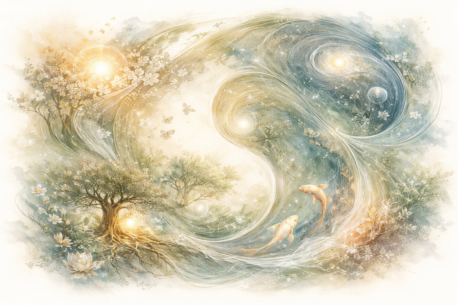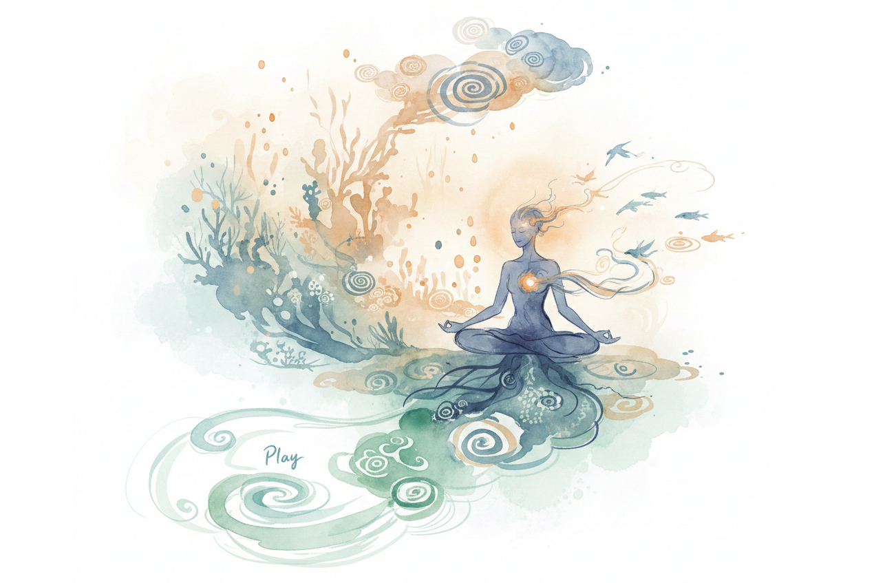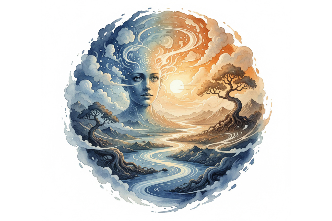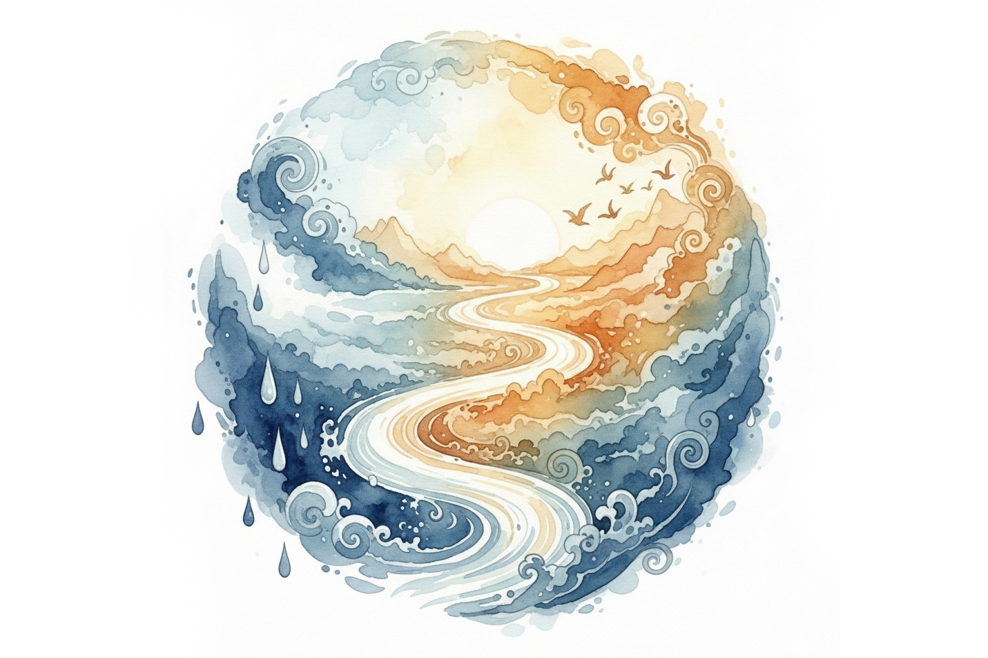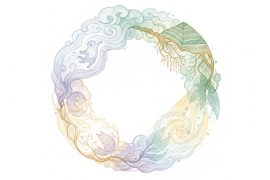 Abstract Zen meditation illustration, no text, no symbols. Gallery-scale composition for large-format print and editorial hero image — contemplative, human-centered, visually commanding without spectacle. Four subtle energies flow in a continuous living rhythm like breath: Play: light, airy motion, spontaneous ink-like brush strokes Learn: layered repetition, gentle refinement, subtle echoes of mathematics, physics, geometry, and AI technology — abstract patterns, iterative structures, evolving forms (no machines or UI) See: soft illumination revealing hidden depth and quiet dimensionality Empathize: warm connective radiance, spirituality, human kindness, compassion Color palette (choose ONE only, exactly four dominant colors: two cool + two warm): A) Dawn — misty blue, pale teal, soft violet, sunrise gold B) Tide — ocean blue, seafoam green, twilight indigo, warm sand C) Ember — blue hour blue, graphite blue, shadowed green, ember orange D) Forest — deep moss green, muted pine, soft charcoal, warm amber Randomly select one palette. Background: pure white, soft edges dissolve into white. Forms: organic only — mist, rivers, mountains, waves, clouds, galaxies, trees, roots, branches, leaves, butterfly, horse, deer, rabbits, doves, birds, fish, coral, seaweed, droplets of light, one human figure, animals — abstracted, gestural, non-photorealistic. No geometry, no symmetry, no mechanical forms, no UI. Composition: layered foreground, midground, background with cinematic depth and micro-details. Mood: mystical, serene, intelligent, deeply human. Texture: watercolor wash and sumi-e ink influence. No text, symbols, logos, icons, watermarks, diagrams, charts. --ar 16:9 --v 6 --q 2 --style raw