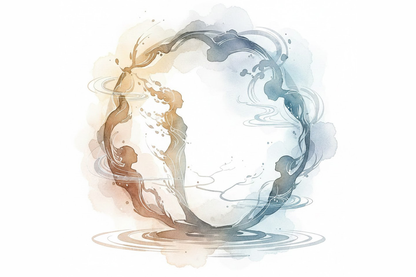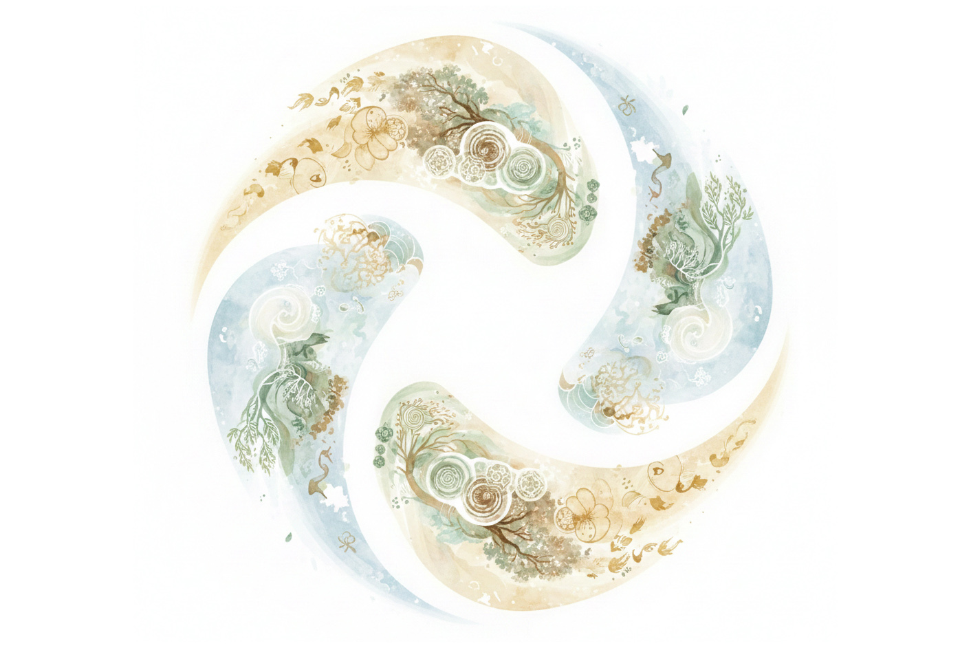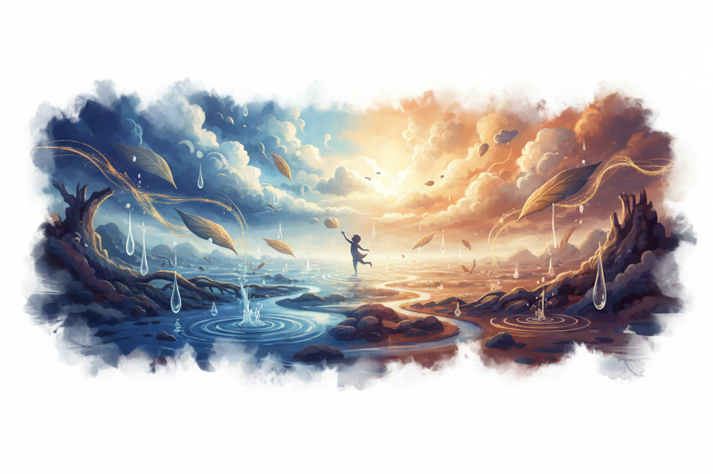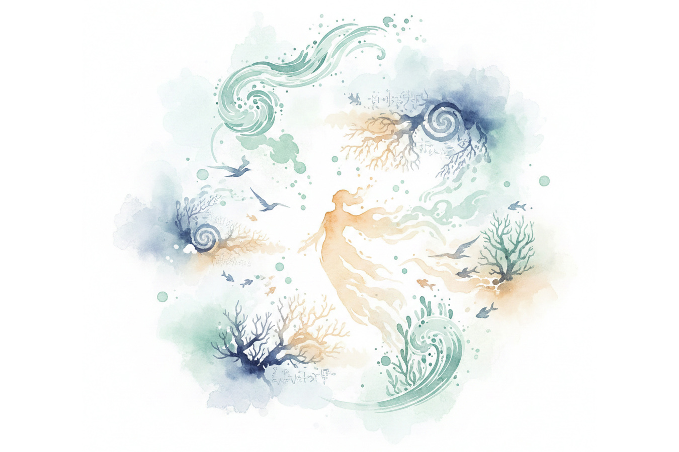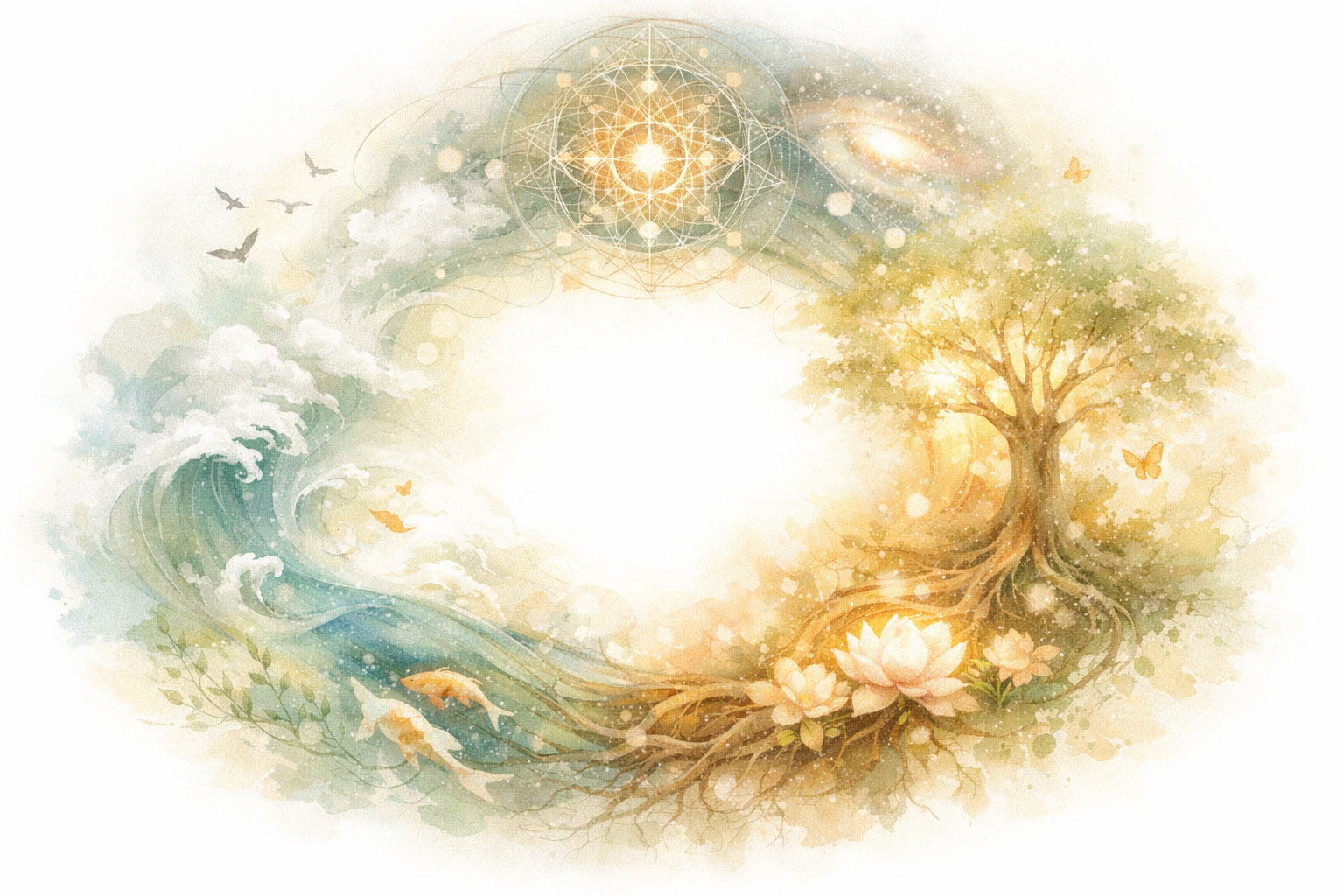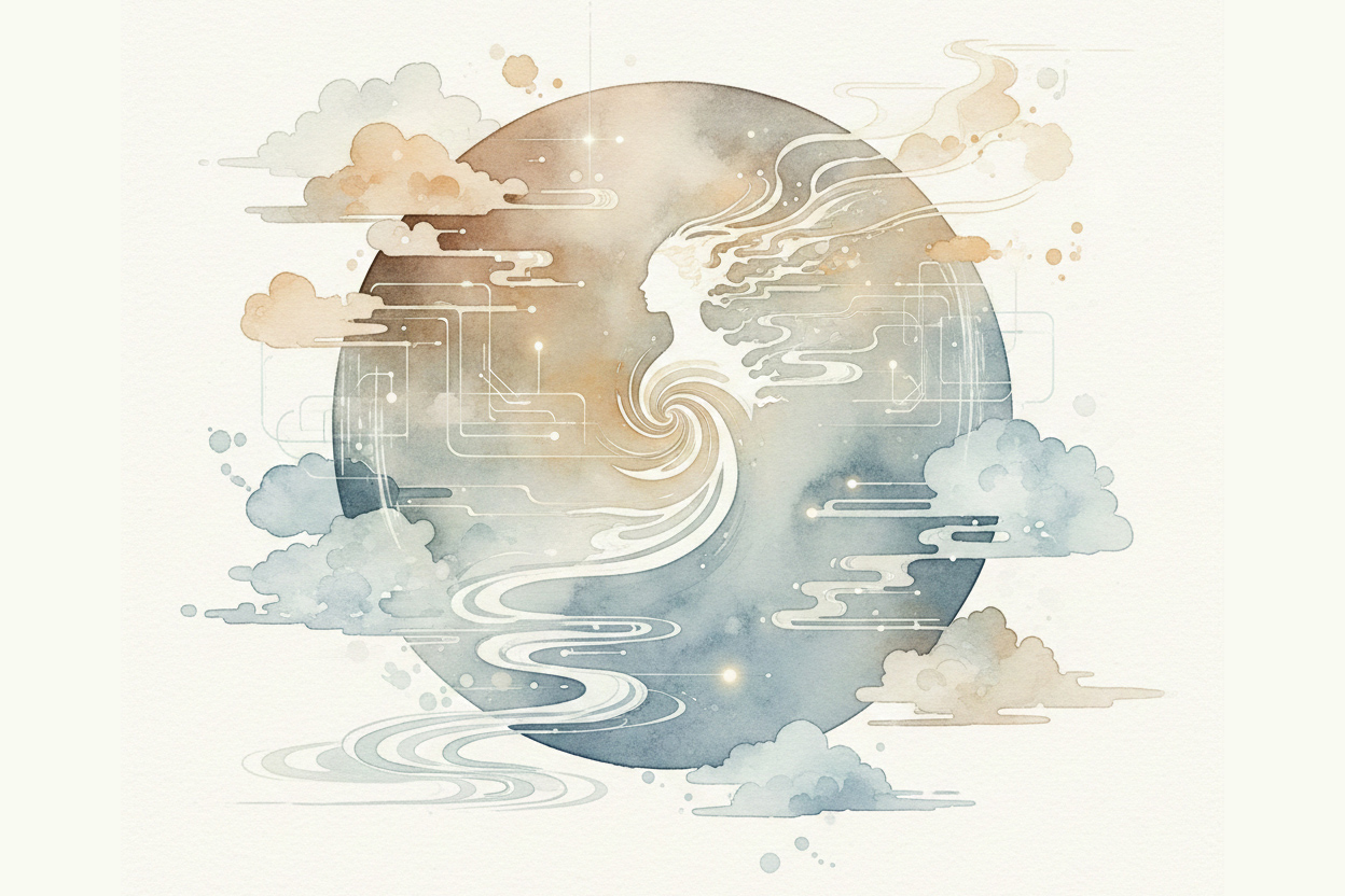 Abstract Zen meditation illustration, no text, no symbols. Gallery-scale composition for large-format print and editorial hero image — contemplative, human-centered, visually commanding without spectacle. Four subtle energies flow in a continuous living rhythm like breath: Play: light, airy motion, spontaneous ink-like brush strokes Learn: layered repetition, gentle refinement, subtle echoes of mathematics, physics, geometry, and AI technology — abstract patterns, iterative structures, evolving forms (no machines or UI) See: soft illumination revealing hidden depth and quiet dimensionality Empathize: warm connective radiance, spirituality, human kindness, compassion Color palette (choose ONE only, exactly four dominant colors: two cool + two warm): A) Dawn — misty blue, pale teal, soft violet, sunrise gold B) Tide — ocean blue, seafoam green, twilight indigo, warm sand C) Ember — blue hour blue, graphite blue, shadowed green, ember orange D) Forest — deep moss green, muted pine, soft charcoal, warm amber Randomly select one palette. Background: pure white, soft edges dissolve into white. Forms: organic only — mist, rivers, mountains, waves, clouds, galaxies, trees, roots, branches, leaves, butterfly, horse, deer, rabbits, doves, birds, fish, coral, seaweed, droplets of light, one human figure, animals — abstracted, gestural, non-photorealistic. No geometry, no symmetry, no mechanical forms, no UI. Composition: layered foreground, midground, background with cinematic depth and micro-details. Mood: mystical, serene, intelligent, deeply human. Texture: watercolor wash and sumi-e ink influence. No text, symbols, logos, icons, watermarks, diagrams, charts. --ar 16:9 --v 6 --q 2 --style raw