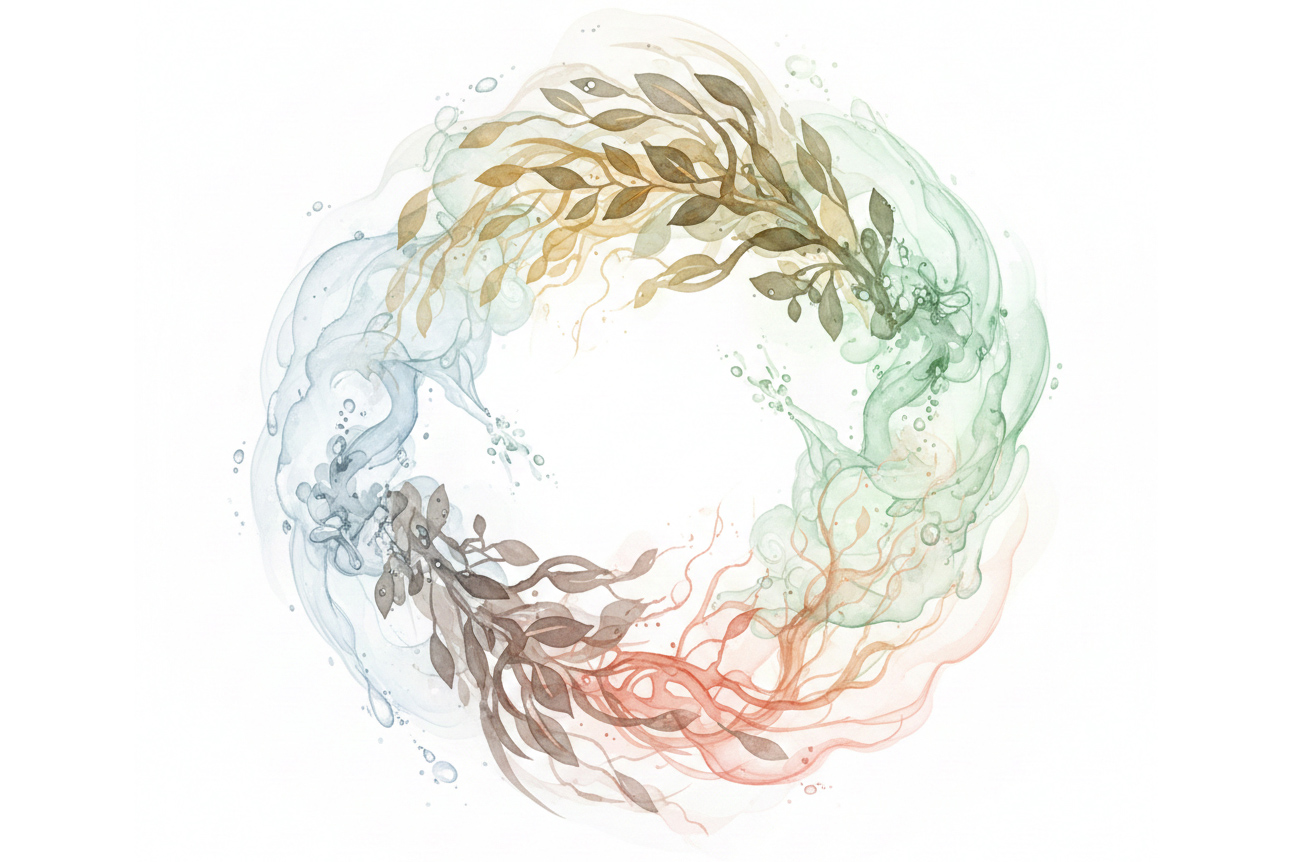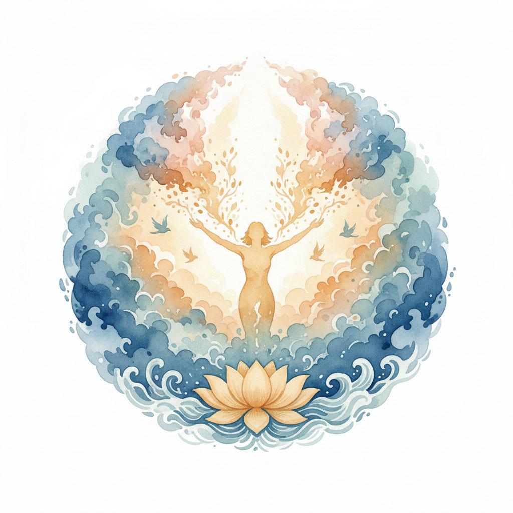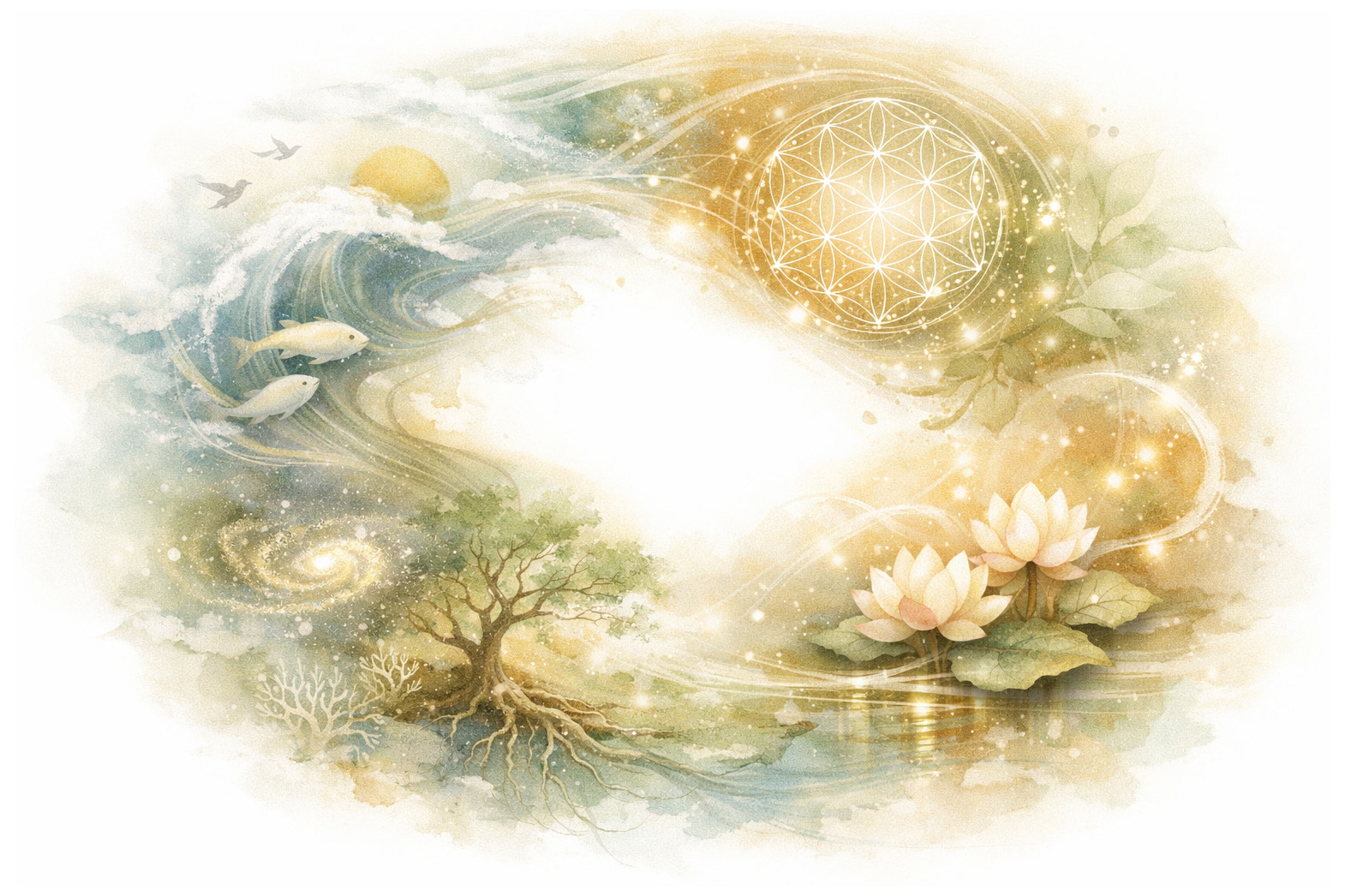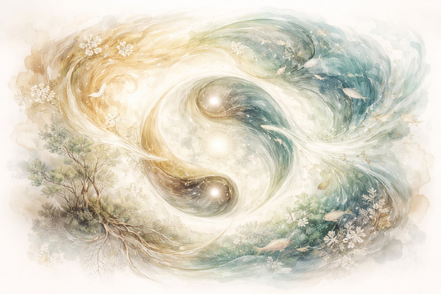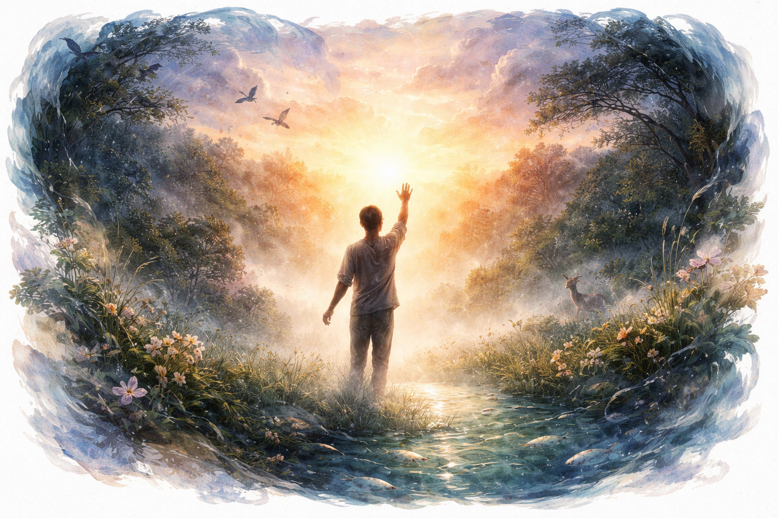 Abstract Zen meditation illustration, no text, no symbols. Gallery-scale composition for large-format print and editorial hero image — contemplative, human-centered, visually commanding without spectacle. Four subtle energies flow in a continuous living rhythm like breath: Play: light, airy motion, spontaneous ink-like brush strokes Learn: layered repetition, gentle refinement, subtle echoes of mathematics, physics, geometry, and AI technology — abstract patterns, iterative structures, evolving forms (no machines or UI) See: soft illumination revealing hidden depth and quiet dimensionality Empathize: warm connective radiance, spirituality, human kindness, compassion Color palette (choose ONE only, exactly four dominant colors: two cool + two warm): A) Dawn — misty blue, pale teal, soft violet, sunrise gold B) Tide — ocean blue, seafoam green, twilight indigo, warm sand C) Ember — blue hour blue, graphite blue, shadowed green, ember orange D) Forest — deep moss green, muted pine, soft charcoal, warm amber Randomly select one palette. Background: pure white, soft edges dissolve into white. Forms: organic only — mist, rivers, mountains, waves, clouds, galaxies, trees, roots, branches, leaves, butterfly, horse, deer, rabbits, doves, birds, fish, coral, seaweed, droplets of light, one human figure, animals — abstracted, gestural, non-photorealistic. No geometry, no symmetry, no mechanical forms, no UI. Composition: layered foreground, midground, background with cinematic depth and micro-details. Mood: mystical, serene, intelligent, deeply human. Texture: watercolor wash and sumi-e ink influence. No text, symbols, logos, icons, watermarks, diagrams, charts. --ar 16:9 --v 6 --q 2 --style raw