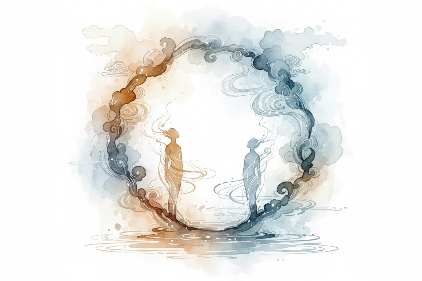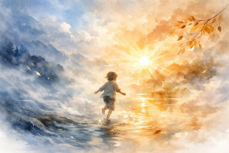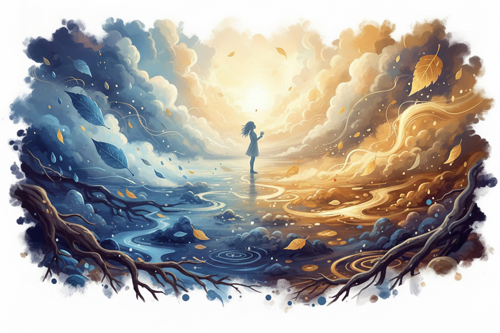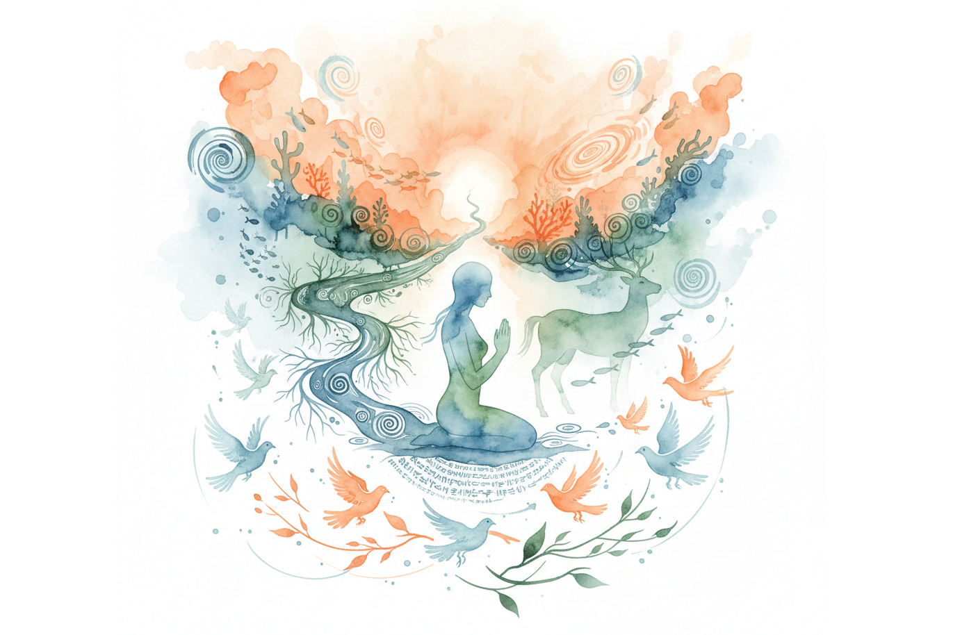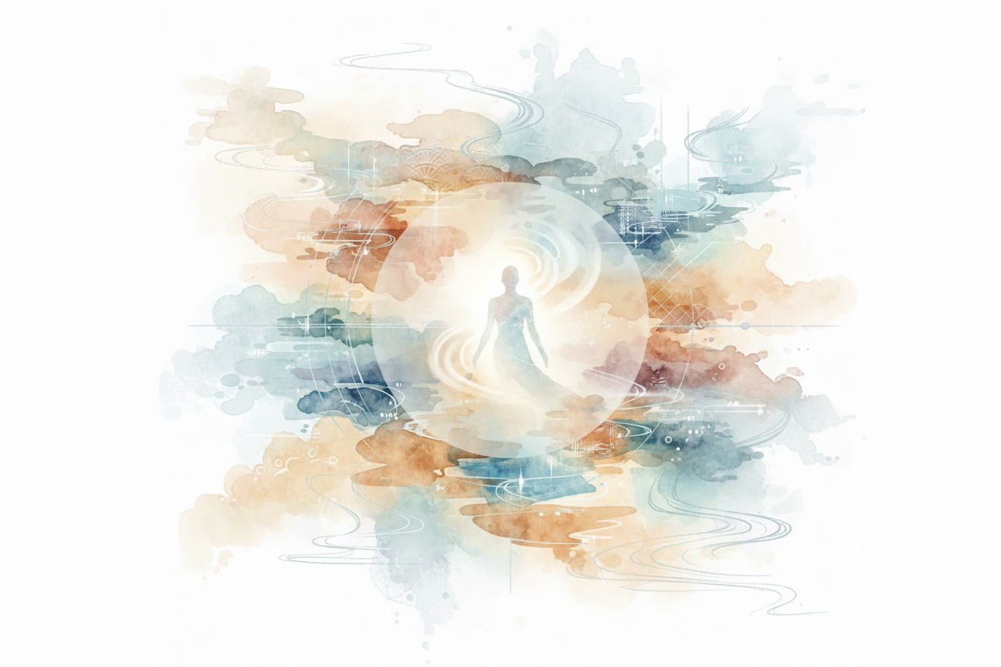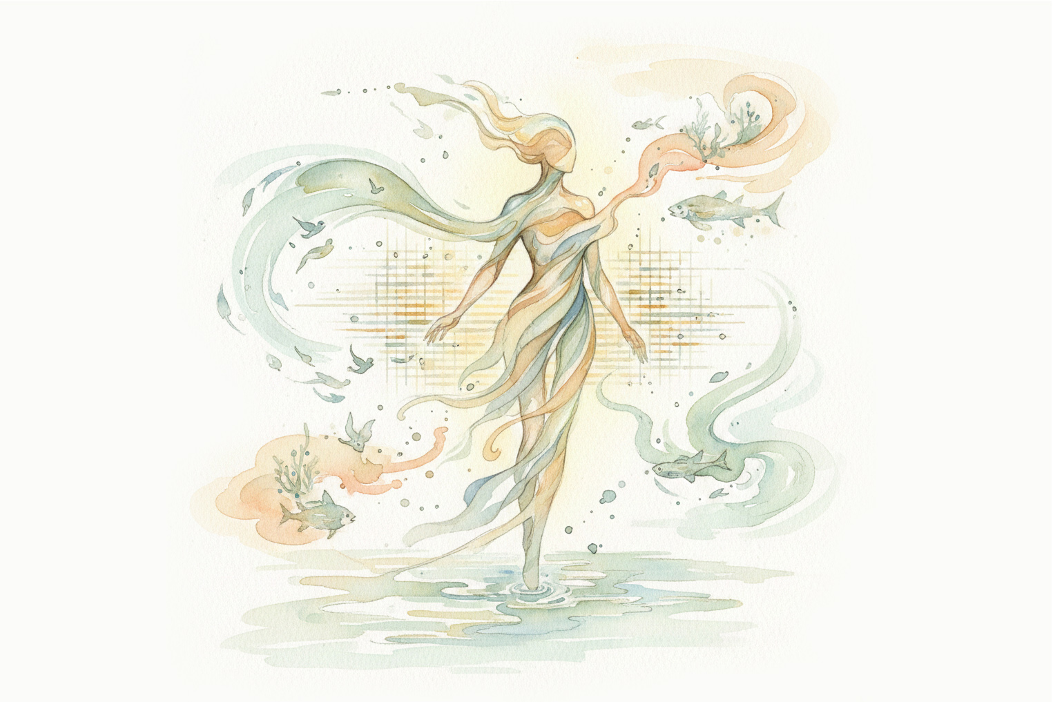 Abstract Zen meditation illustration, no text, no symbols. Gallery-scale composition for large-format print and editorial hero image — contemplative, human-centered, visually commanding without spectacle. Four subtle energies flow in a continuous living rhythm like breath: Play: light, airy motion, spontaneous ink-like brush strokes Learn: layered repetition, gentle refinement, subtle echoes of mathematics, physics, geometry, and AI technology — abstract patterns, iterative structures, evolving forms (no machines or UI) See: soft illumination revealing hidden depth and quiet dimensionality Empathize: warm connective radiance, spirituality, human kindness, compassion Color palette (choose ONE only, exactly four dominant colors: two cool + two warm): A) Dawn — misty blue, pale teal, soft violet, sunrise gold B) Tide — ocean blue, seafoam green, twilight indigo, warm sand C) Ember — blue hour blue, graphite blue, shadowed green, ember orange D) Forest — deep moss green, muted pine, soft charcoal, warm amber Randomly select one palette. Background: pure white, soft edges dissolve into white. Forms: organic only — mist, rivers, mountains, waves, clouds, galaxies, trees, roots, branches, leaves, butterfly, horse, deer, rabbits, doves, birds, fish, coral, seaweed, droplets of light, one human figure, animals — abstracted, gestural, non-photorealistic. No geometry, no symmetry, no mechanical forms, no UI. Composition: layered foreground, midground, background with cinematic depth and micro-details. Mood: mystical, serene, intelligent, deeply human. Texture: watercolor wash and sumi-e ink influence. No text, symbols, logos, icons, watermarks, diagrams, charts. --ar 16:9 --v 6 --q 2 --style raw