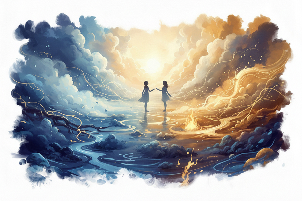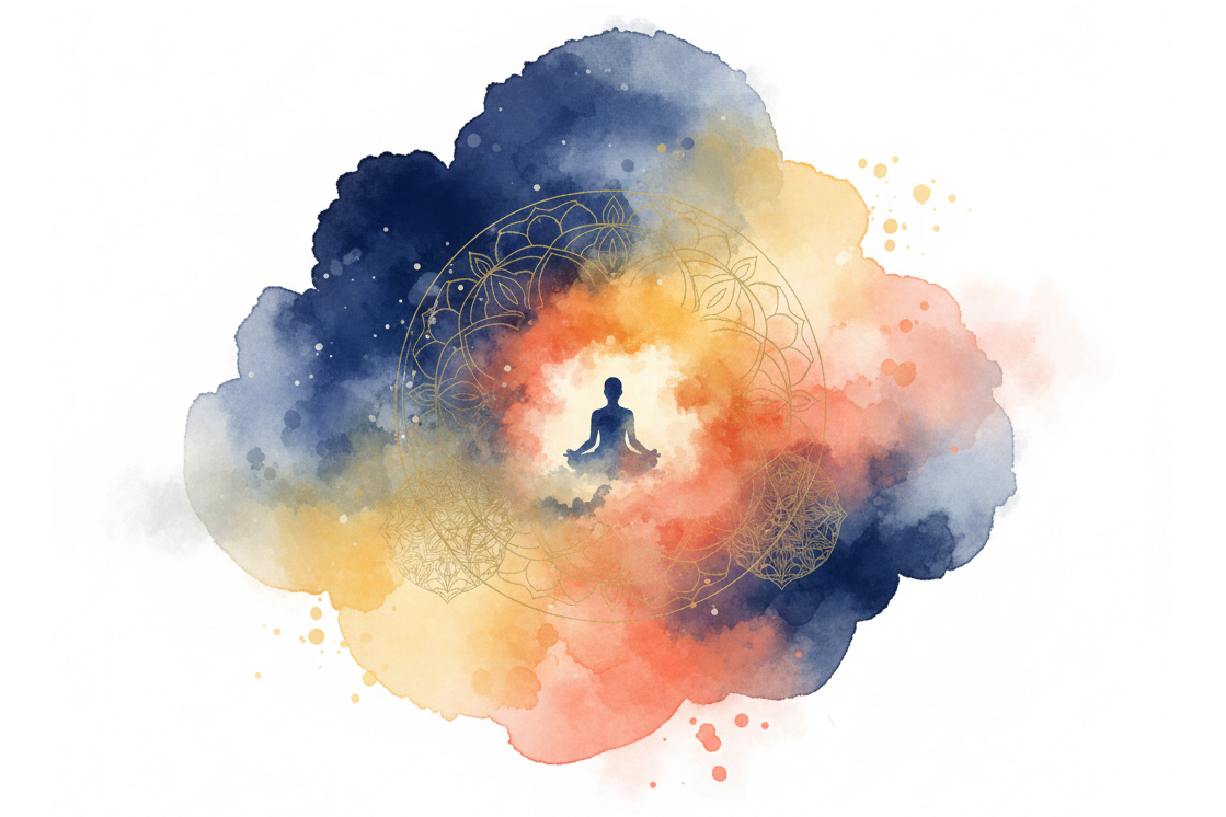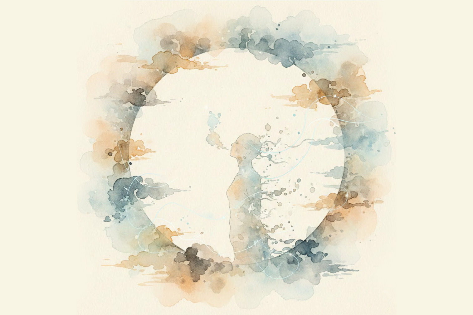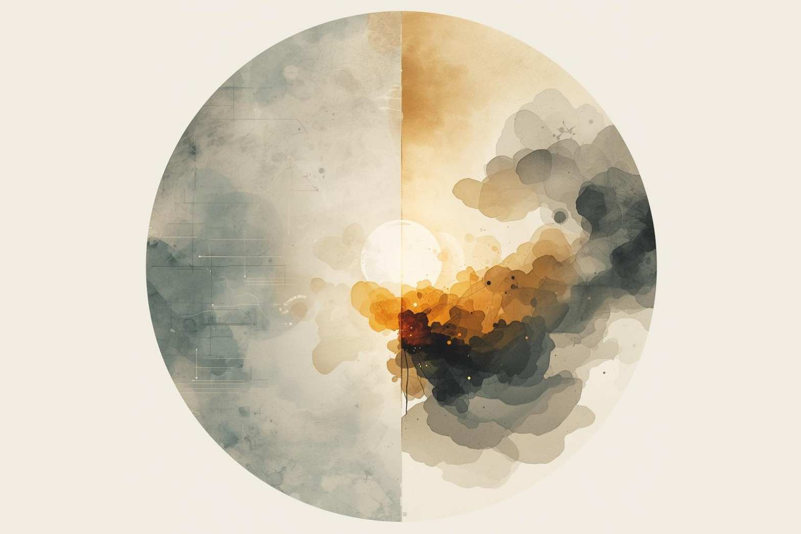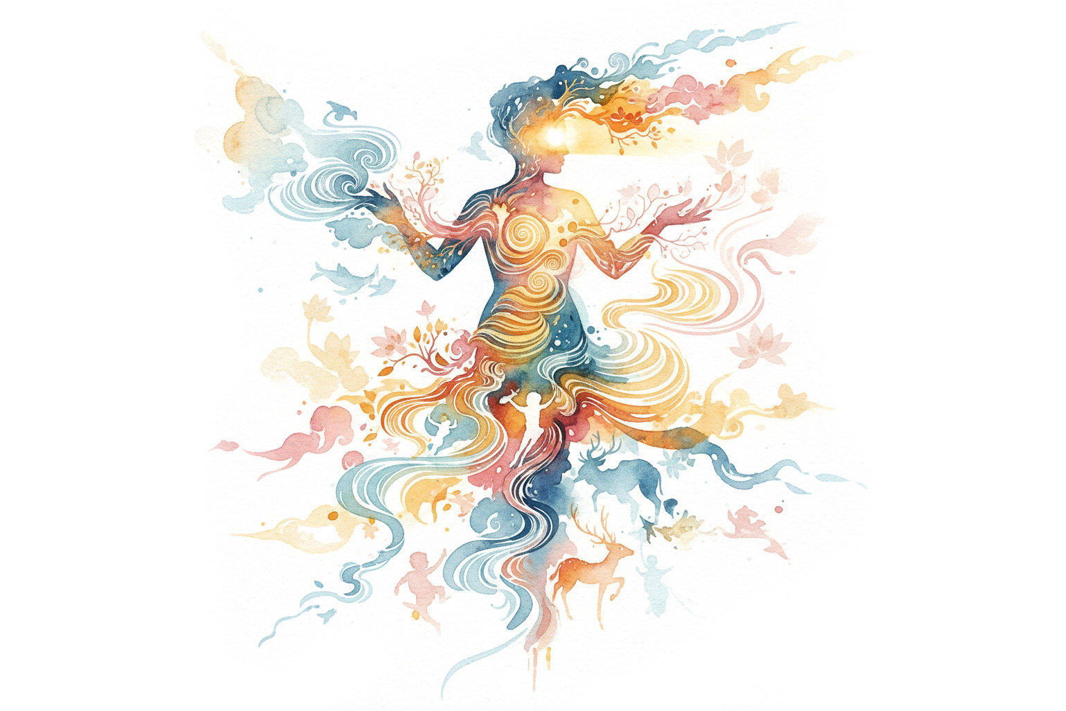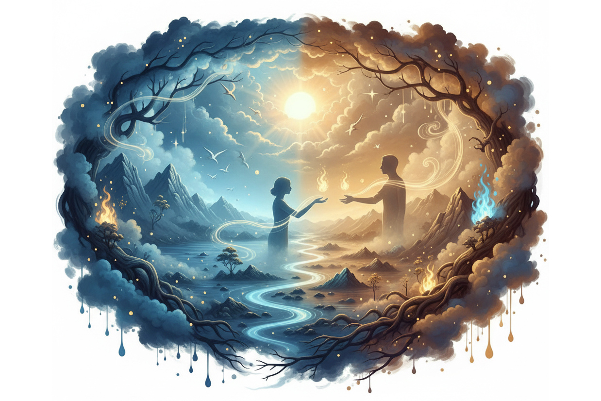Abstract Zen meditation illustration, no text, no symbols. Gallery-scale composition for large-format print and editorial hero image — contemplative, human-centered, visually commanding without spectacle. Four subtle energies flow in a continuous living rhythm like breath: Play: light, airy motion, spontaneous ink-like brush strokes Learn: layered repetition, gentle refinement, subtle echoes of mathematics, physics, geometry, and AI technology — abstract patterns, iterative structures, evolving forms (no machines or UI) See: soft illumination revealing hidden depth and quiet dimensionality Empathize: warm connective radiance, spirituality, human kindness, compassion Color palette (choose ONE only, exactly four dominant colors: two cool + two warm): A) Dawn — misty blue, pale teal, soft violet, sunrise gold B) Tide — ocean blue, seafoam green, twilight indigo, warm sand C) Ember — blue hour blue, graphite blue, shadowed green, ember orange D) Forest — deep moss green, muted pine, soft charcoal, warm amber Randomly select one palette. Background: pure white, soft edges dissolve into white. Forms: organic only — mist, rivers, mountains, waves, clouds, galaxies, trees, roots, branches, leaves, butterfly, horse, deer, rabbits, doves, birds, fish, coral, seaweed, droplets of light, one human figure, animals — abstracted, gestural, non-photorealistic. No geometry, no symmetry, no mechanical forms, no UI. Composition: layered foreground, midground, background with cinematic depth and micro-details. Mood: mystical, serene, intelligent, deeply human. Texture: watercolor wash and sumi-e ink influence. No text, symbols, logos, icons, watermarks, diagrams, charts. --ar 16:9 --v 6 --q 2 --style raw
